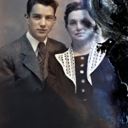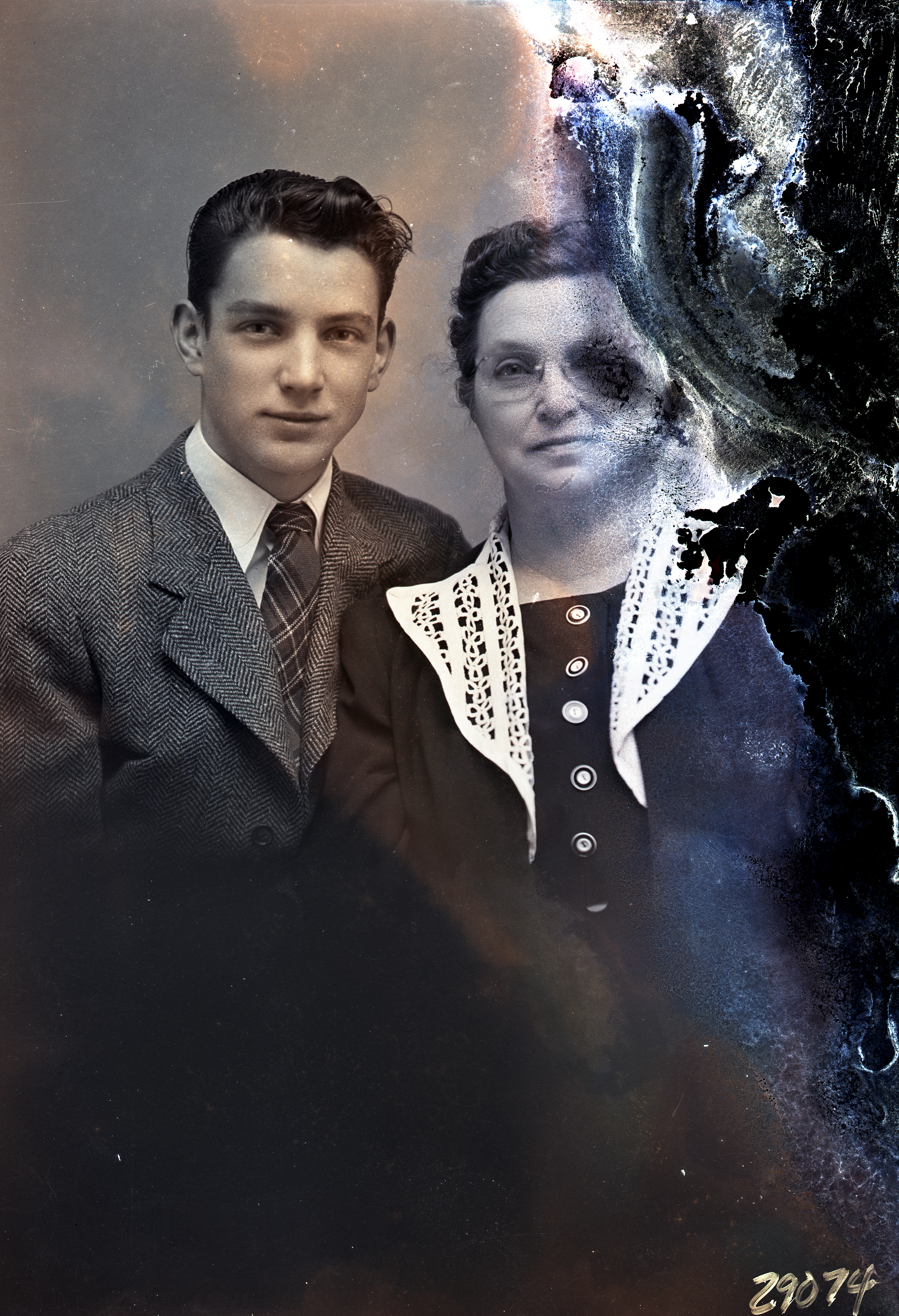 Portrait photograph of an unidentified young man in a suit and plaid tie beside an older unidentified woman with glasses.
