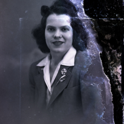 Portrait photograph of an unidentified young woman with short hair and wearing a large pin on the lapel of her jacket.