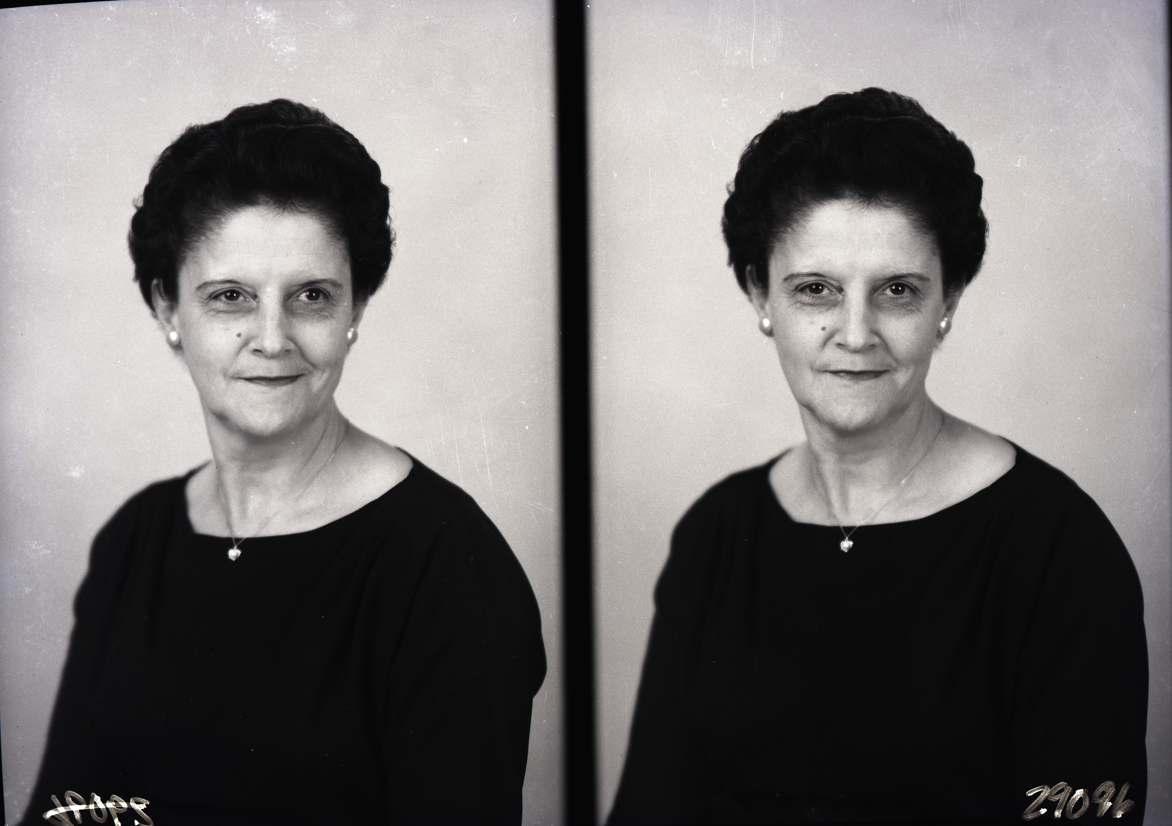 Photo of two separate portrait photographs of the same unidentified woman with short hair and earrings.