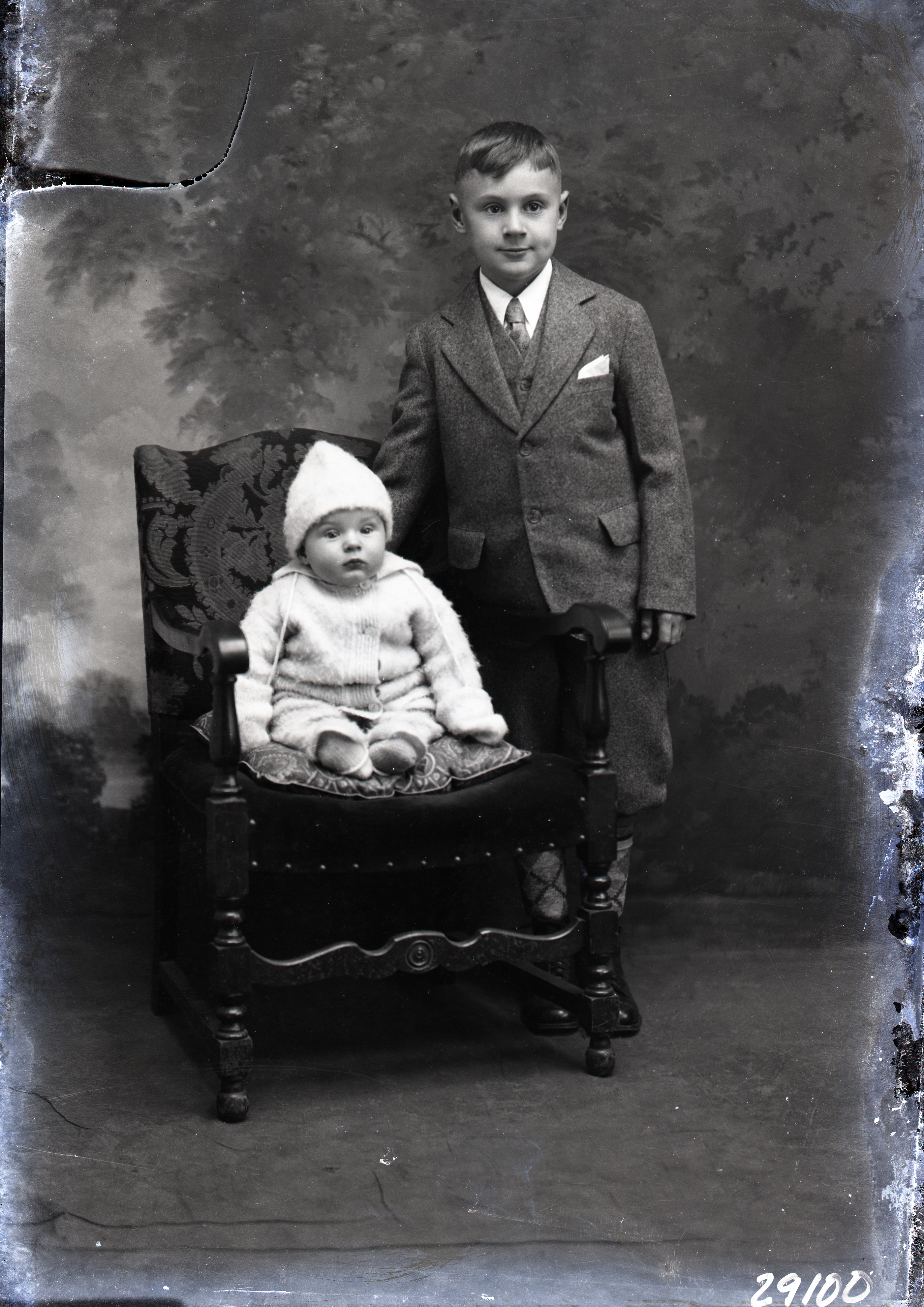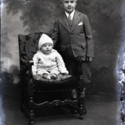 Two unidentified children, a baby in a hat and an older boy in a suit with short pants, are posed together with a chair.