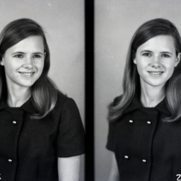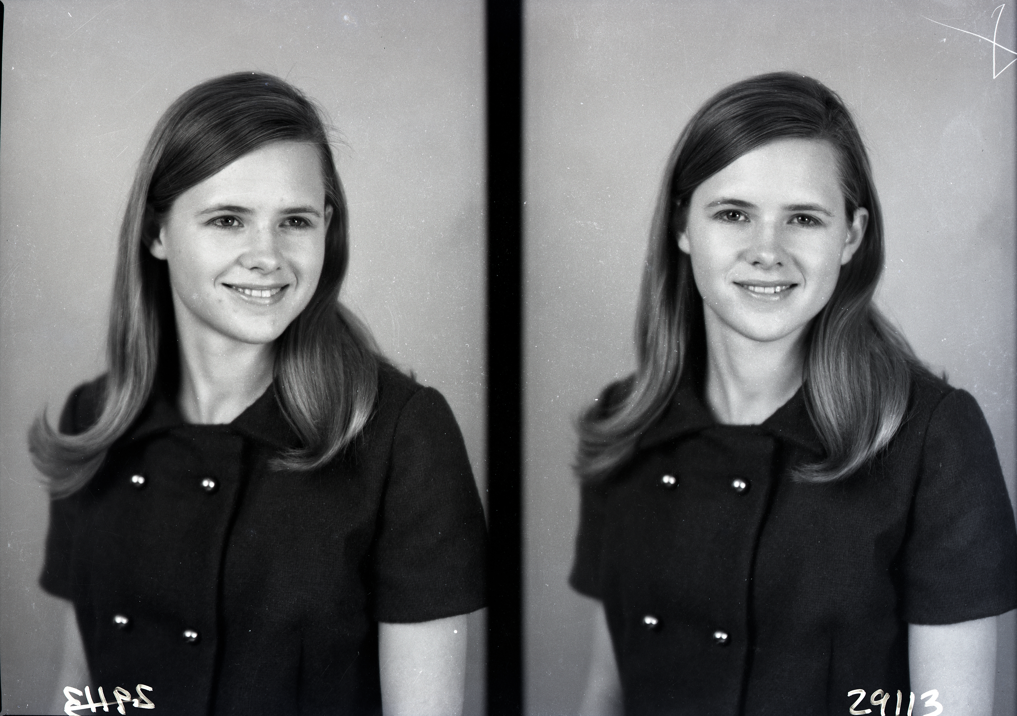 Photo of two separate portrait photographs of the same unidentified young woman with long straight hair worn behind her ears.