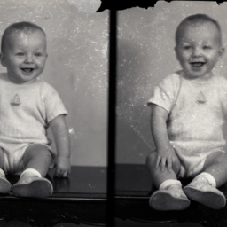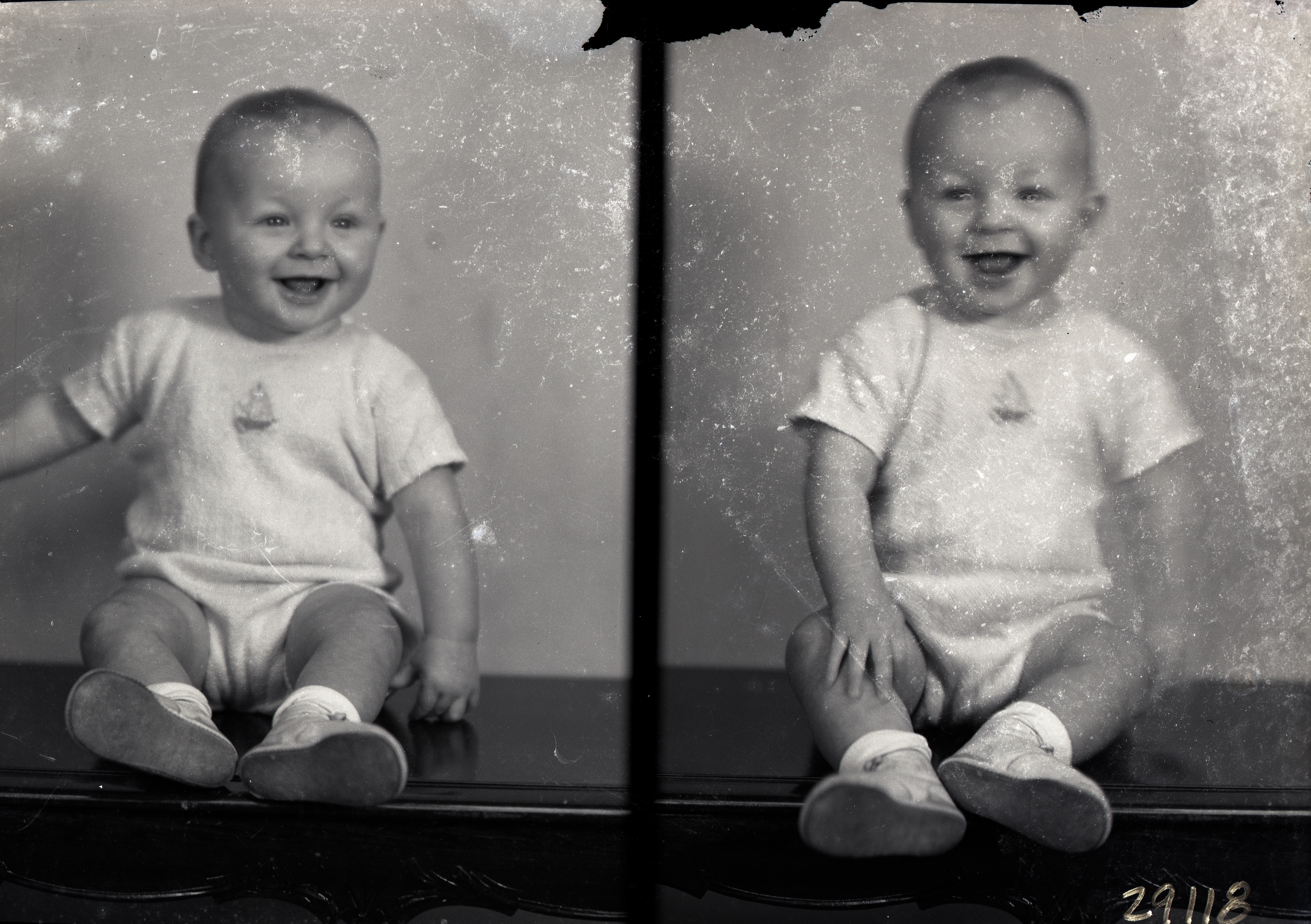 Photo of two separate photographs of the same unidentified young child seated and smiling.