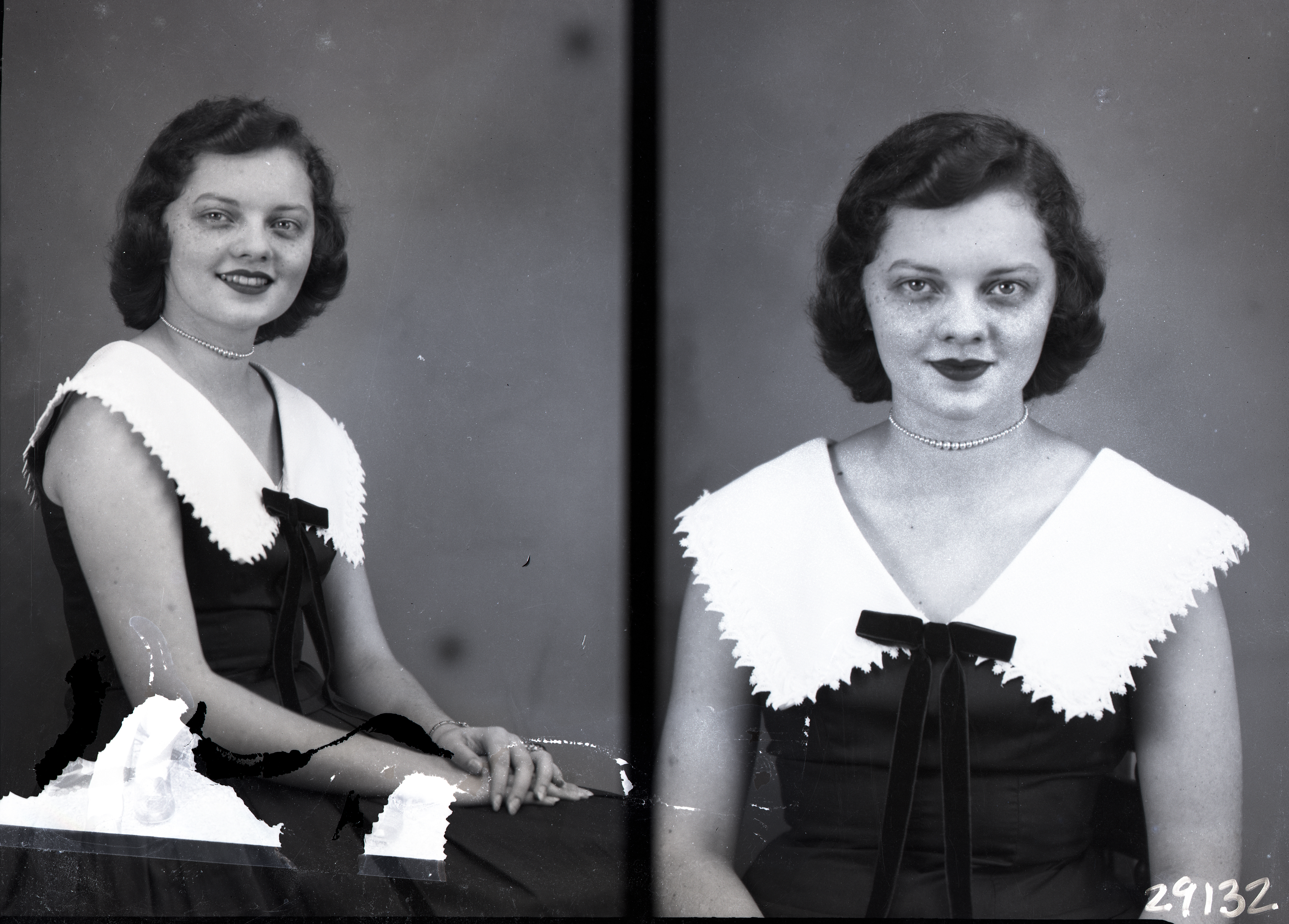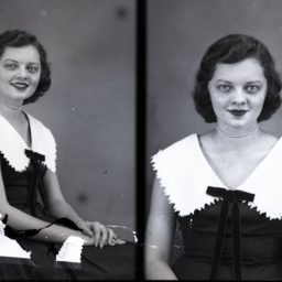 Photo of two separate portrait photographs of the same unidentified woman with short hair and wearing a dark dress with a wide, white collar.
