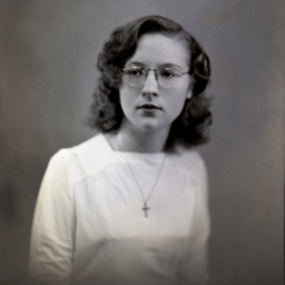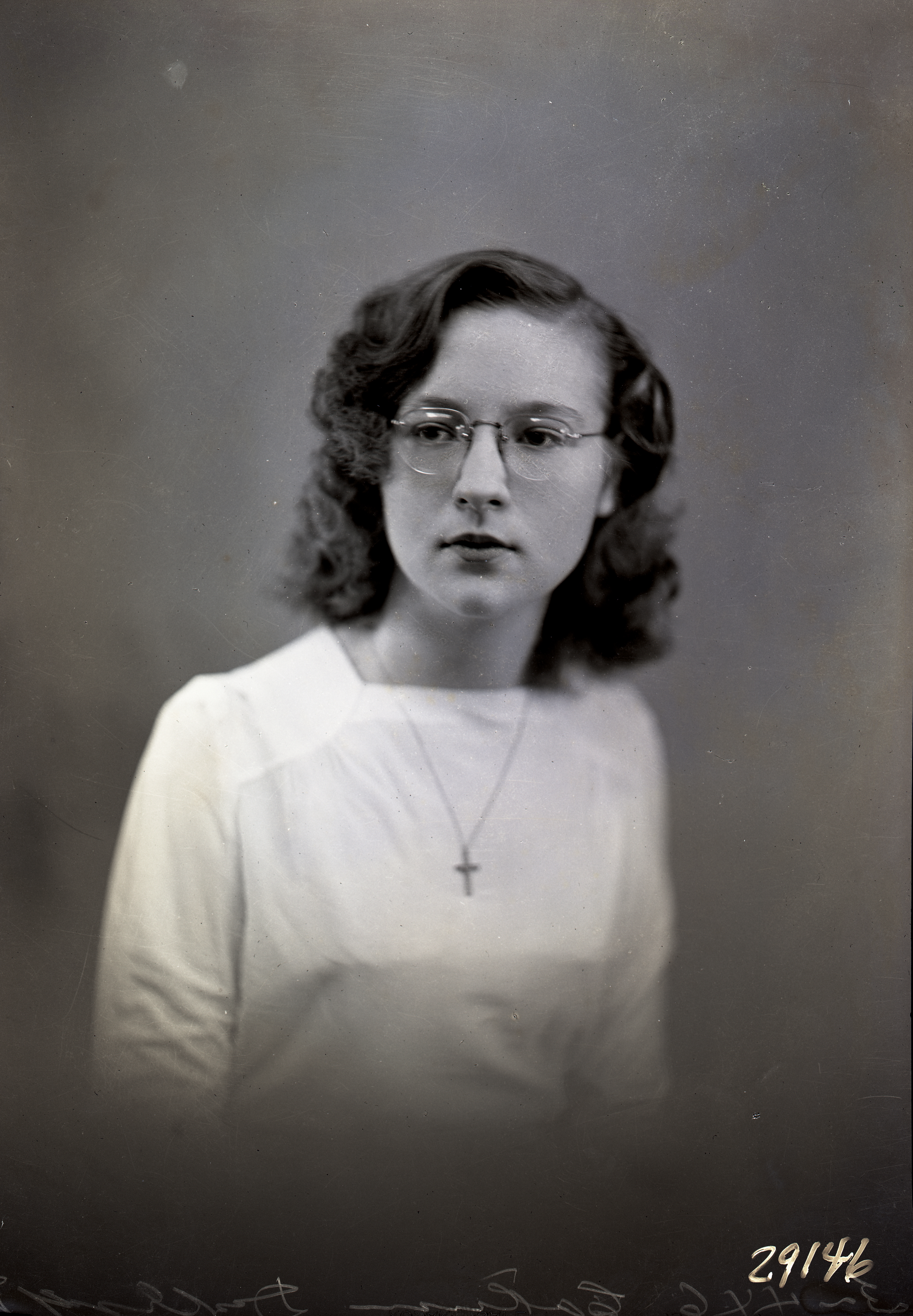 Portrait photograph of an unidentified young woman with curly hair parted on the side, glasses and wearing a cross necklace with her dress.