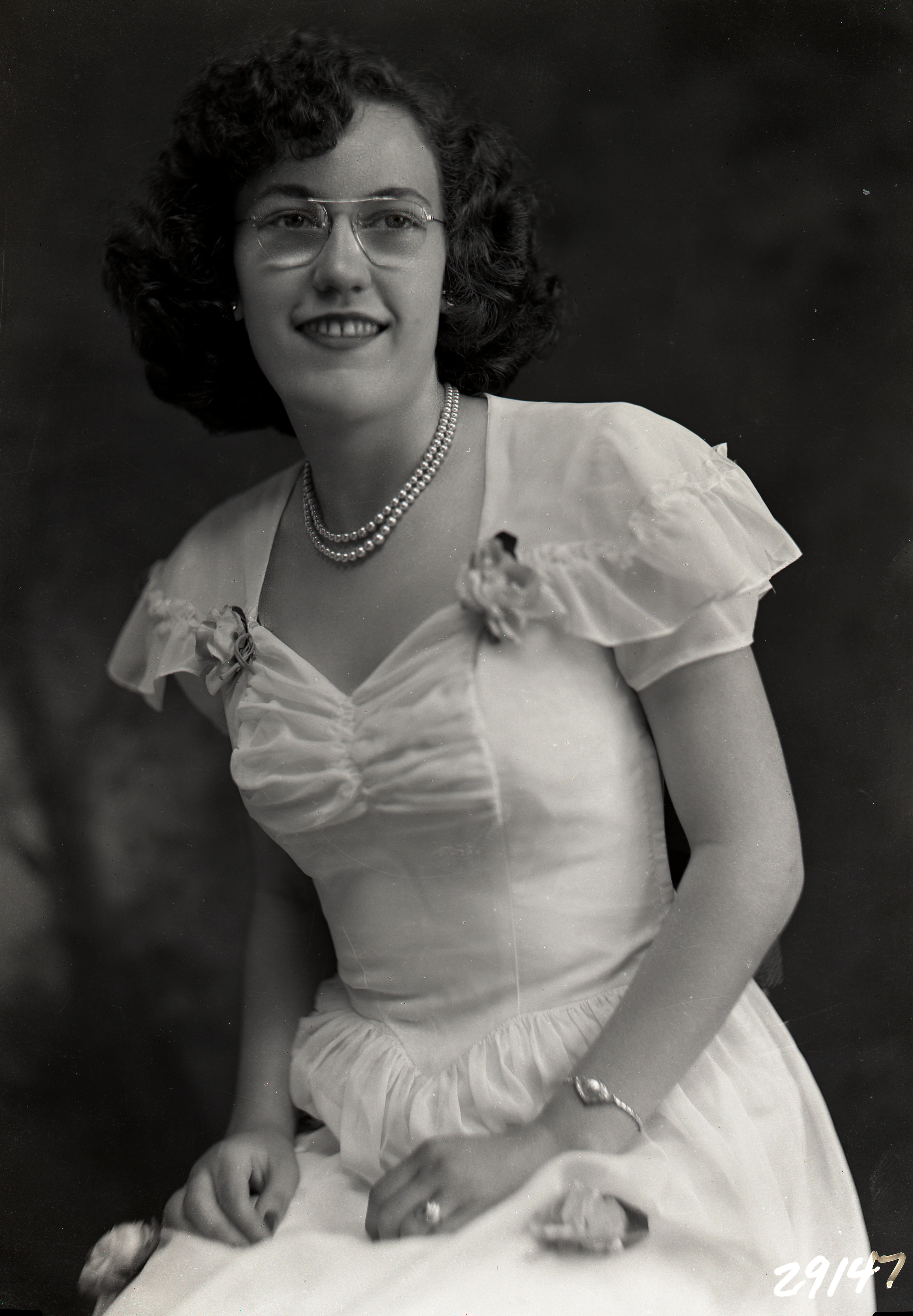 Photograph of Trilby (Hollar) Daggett as a young woman with curly short hair and glasses. She is wearing a corsage pinned to her dress.