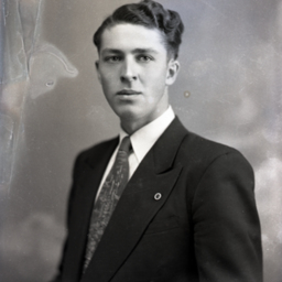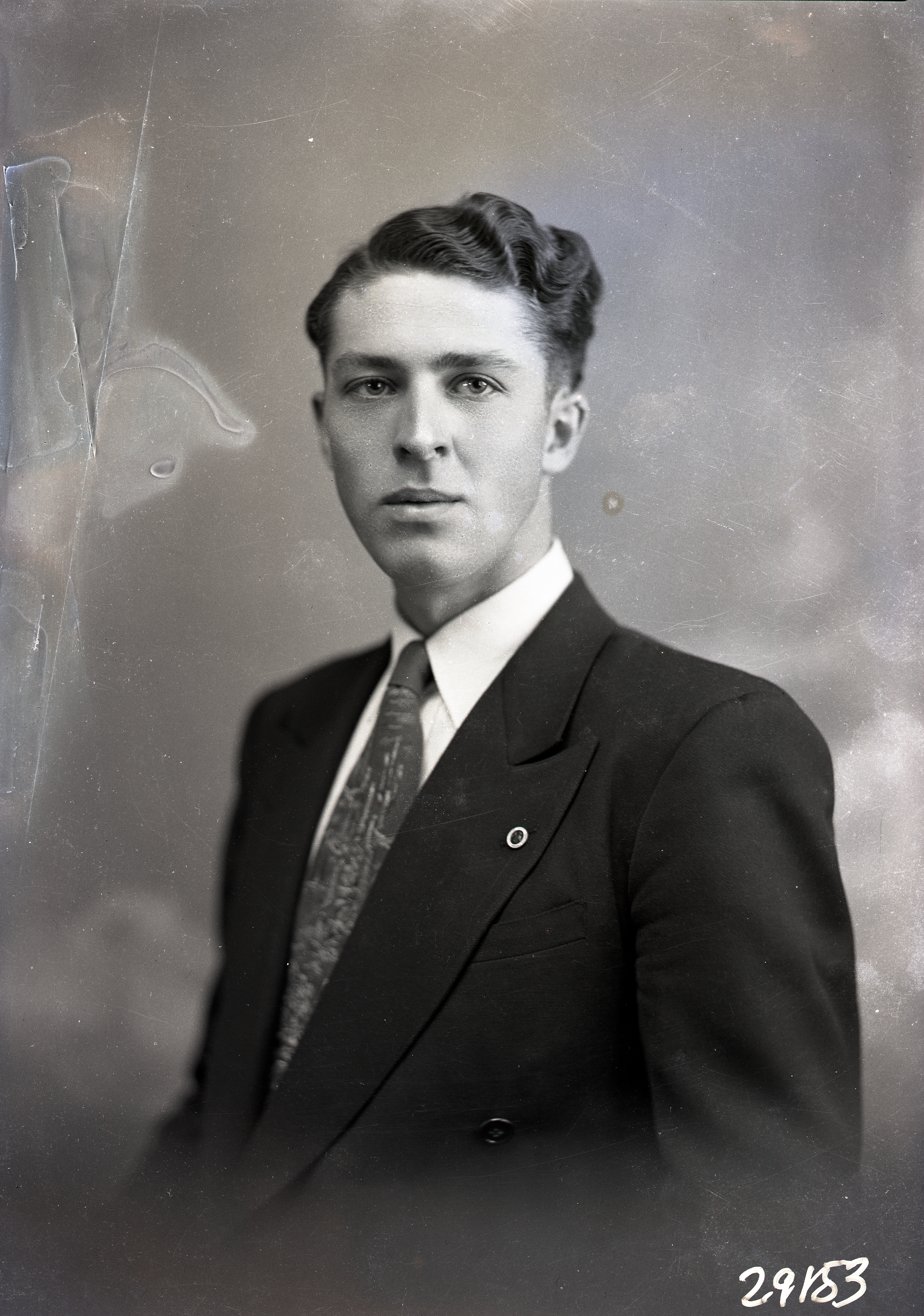 Portrait photograph of an unidentified young man with wavy hair wearing a suit and tie with a pin on his lapel.