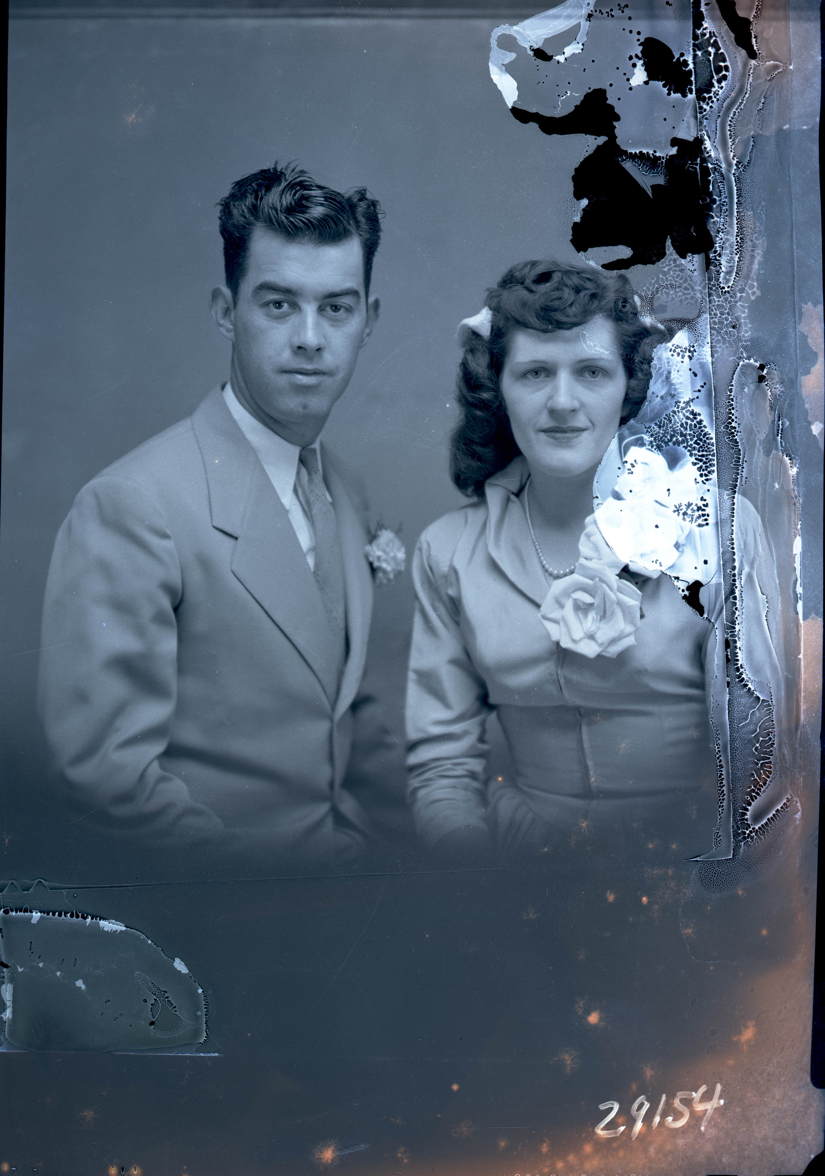Damaged portrait photograph of an unidentified man and woman posed together. He has a boutonniere on his jacket lapel and she is wearing a corsage on her dress.