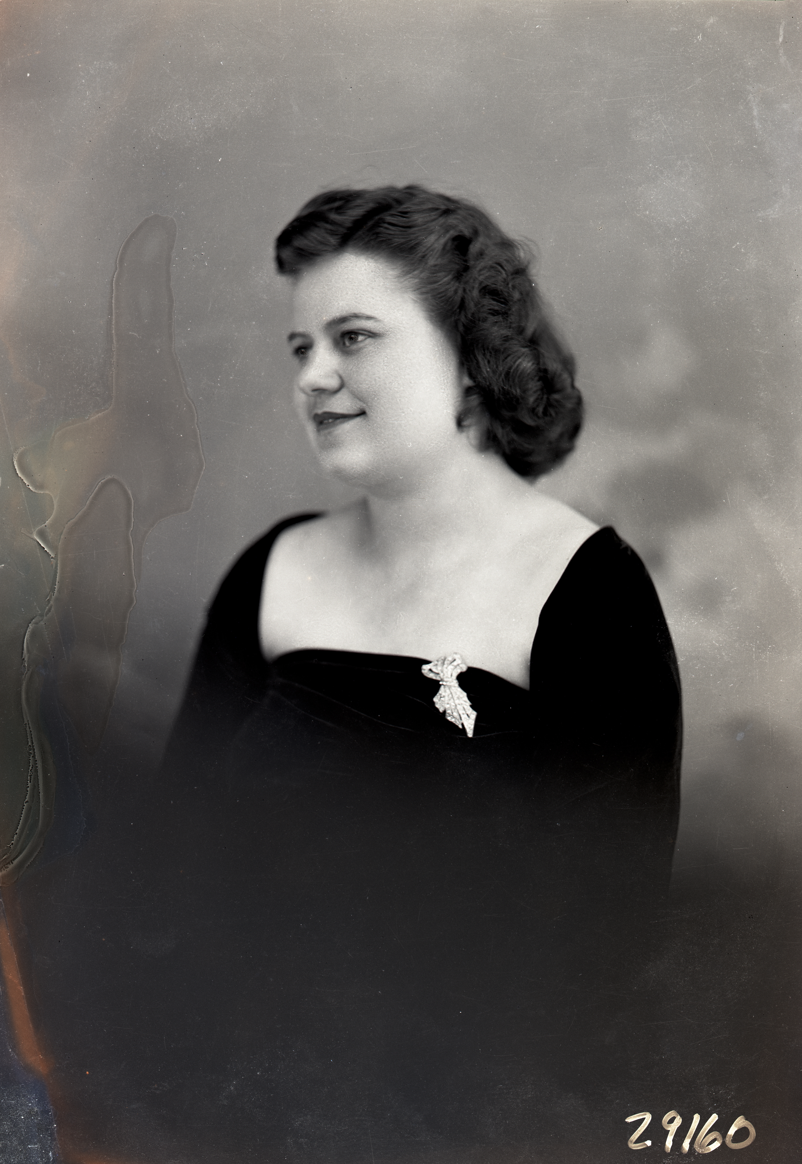 Portrait photograph of an unidentified young woman with short dark hair and wearing a pin on her dress.