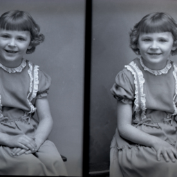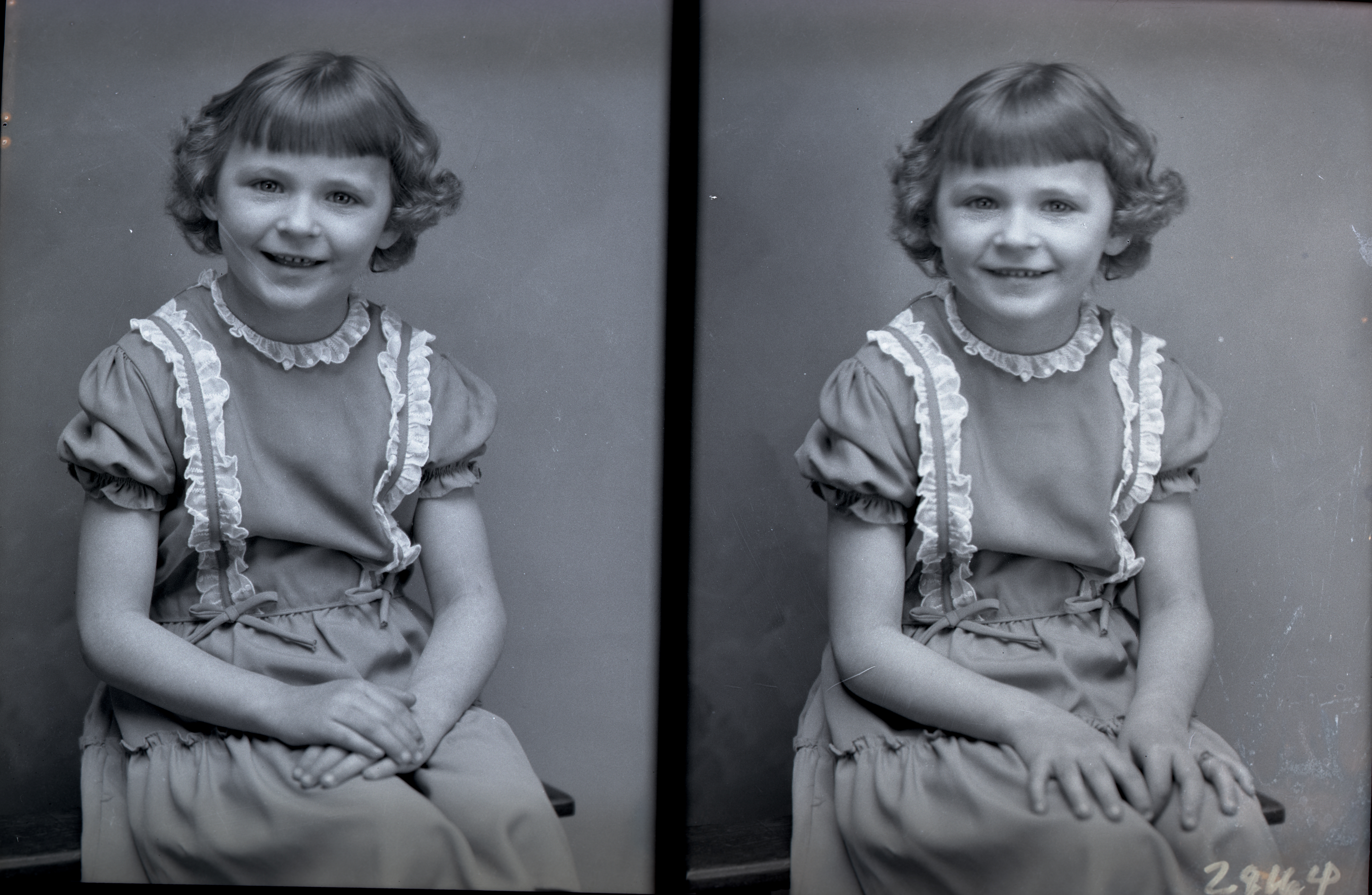 Photo of two separate photographs of the same unidentified young girl with short curly hair and bangs. She is seated, smiling, with her hands on her knees.