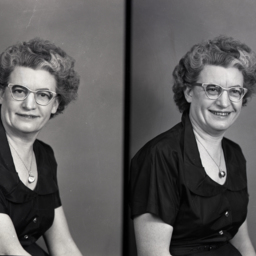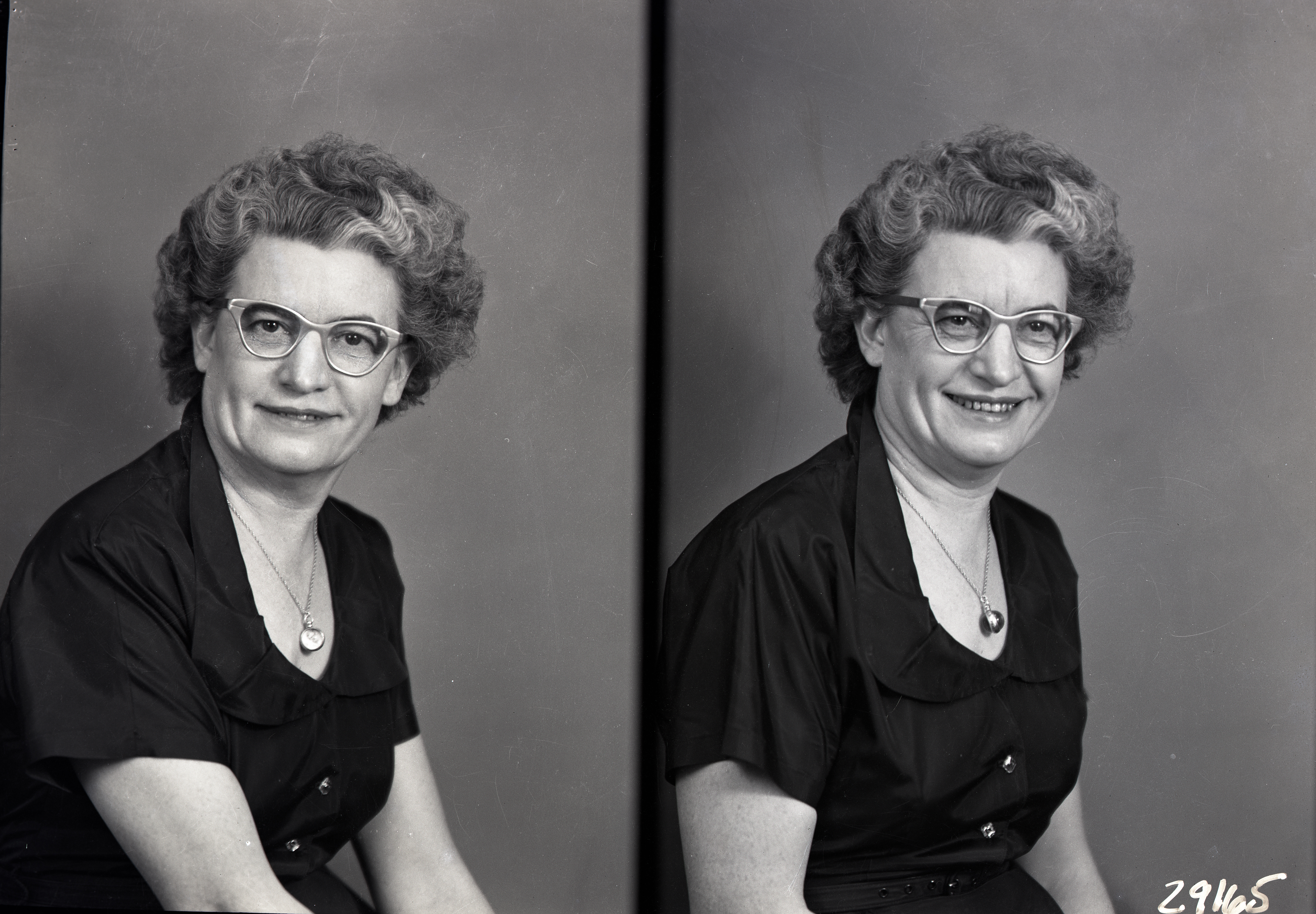 Photo of two separate portrait photographs of the same unidentified woman with short styled hair and glasses.