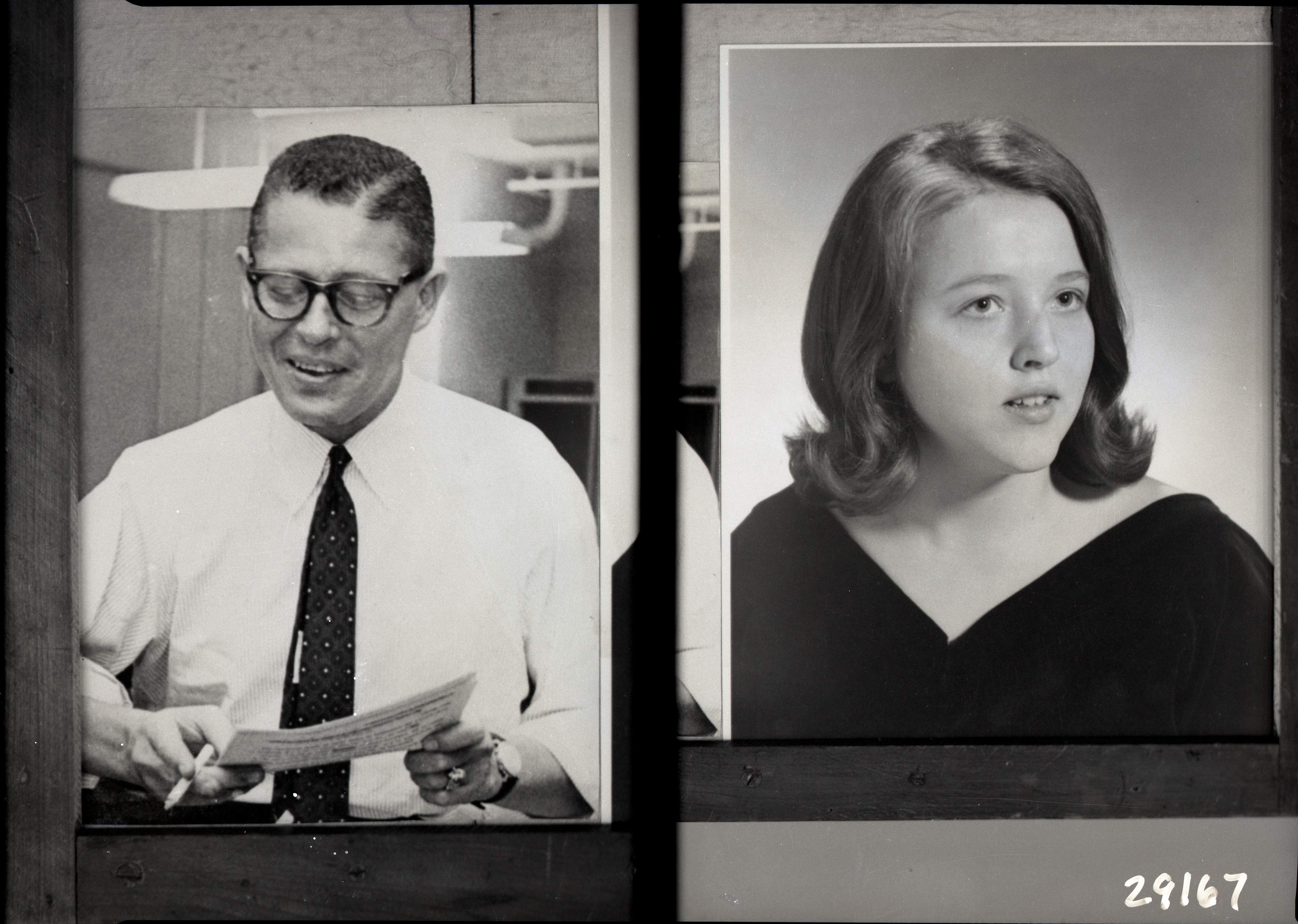 On the right, is an unidentified young woman with shoulder-length hair curled outwards.