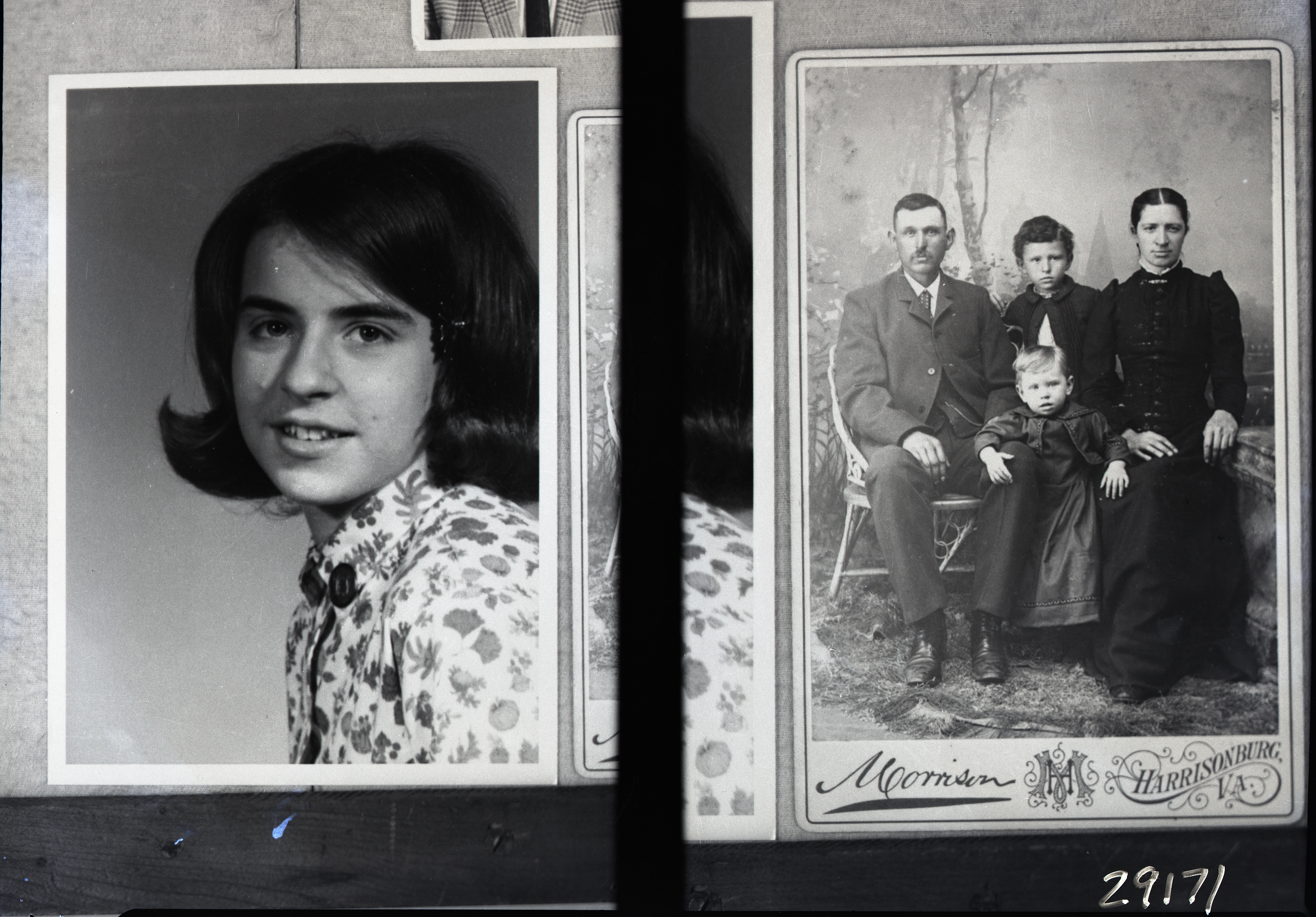 On the right is a copy of an earlier Morrison image of an unidentified family posed together. The original photograph was made by the Morrison Studios in Harrisonburg, Virginia.