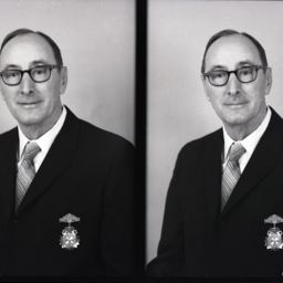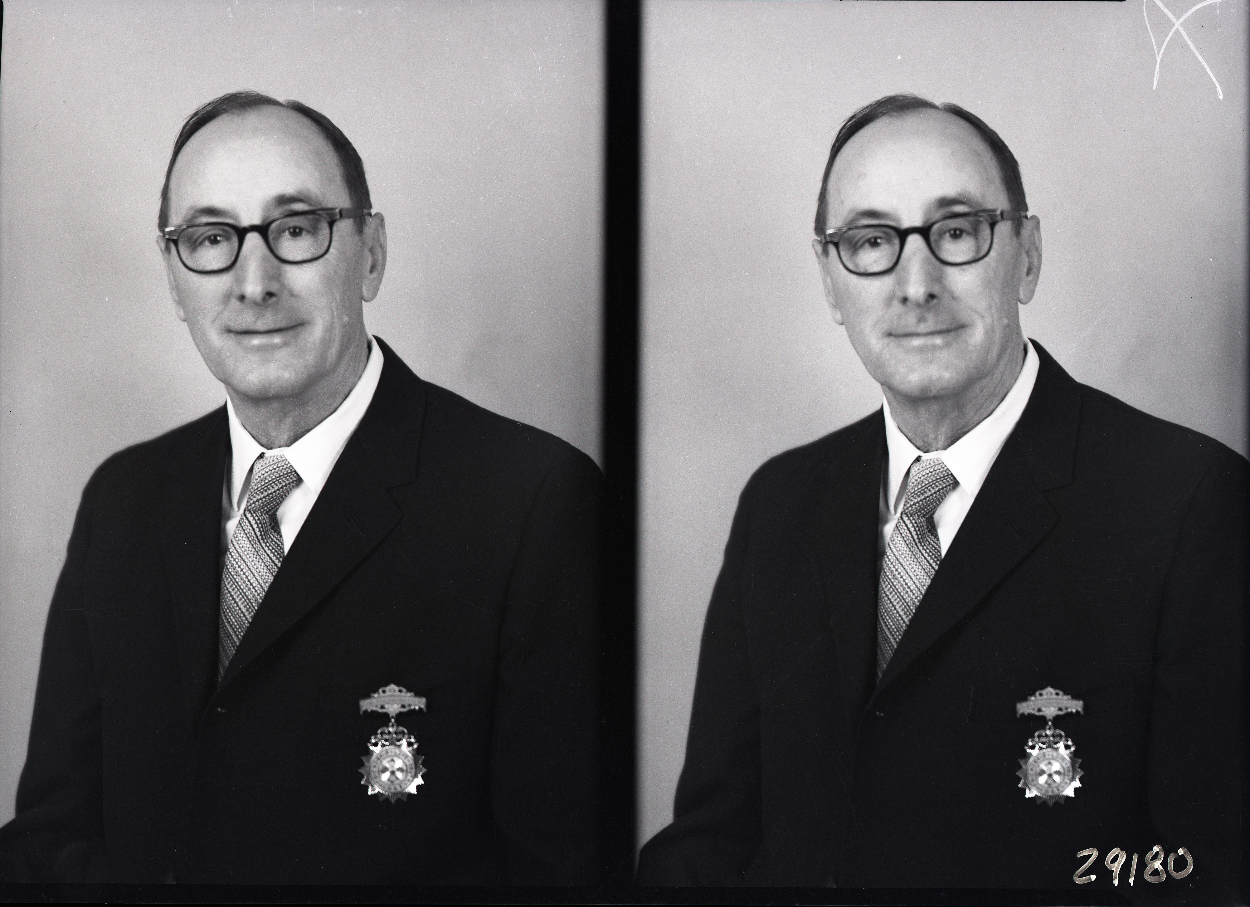 Photo of two separate portrait photographs of the same unidentified man with glasses in a suit and patterned tie.