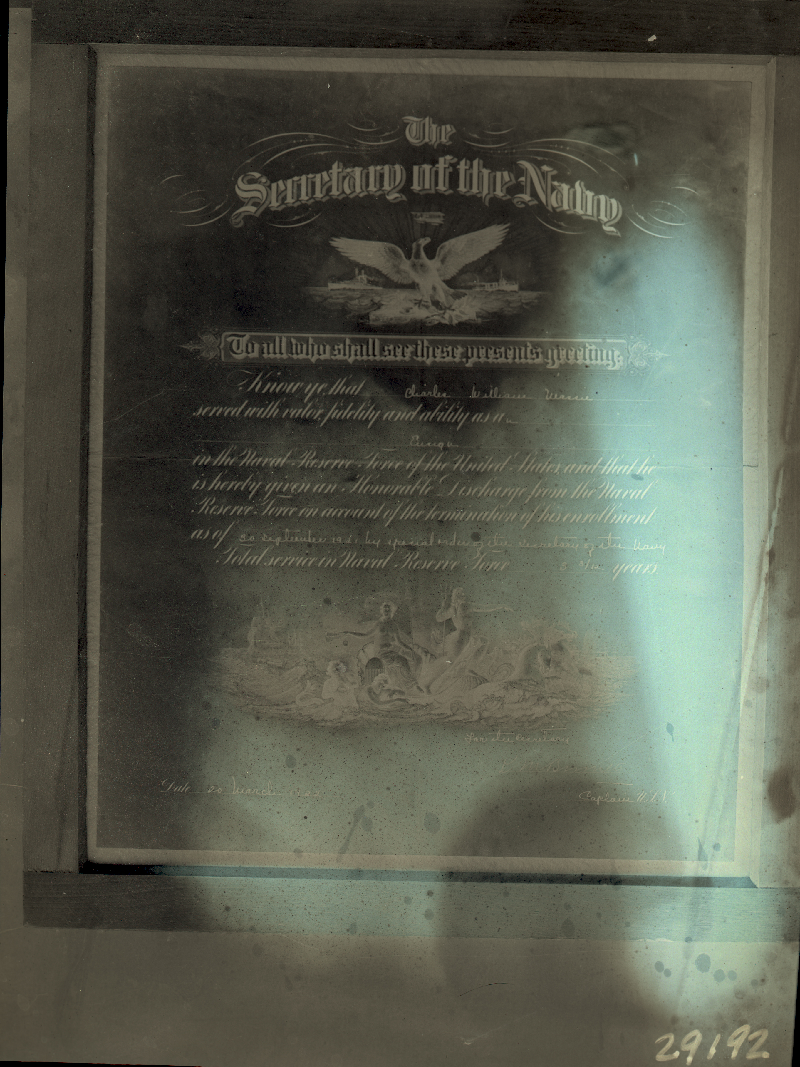 Photograph of the certificate issued to Ensign Charles William _____ in September 1921 by the Secretary of the Navy. The document asserts that he finished his 3 1/2 years of service and was being honorably discharged.