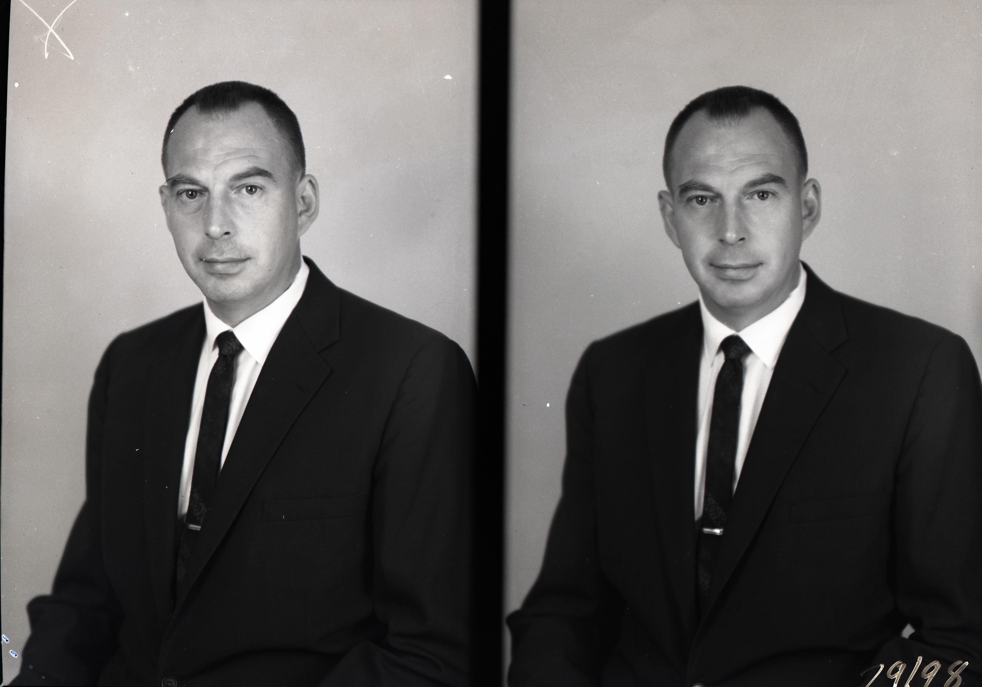 Photo of two separate portrait photographs of William F. Dalke, Jr., as a young man in a suit and tie.
