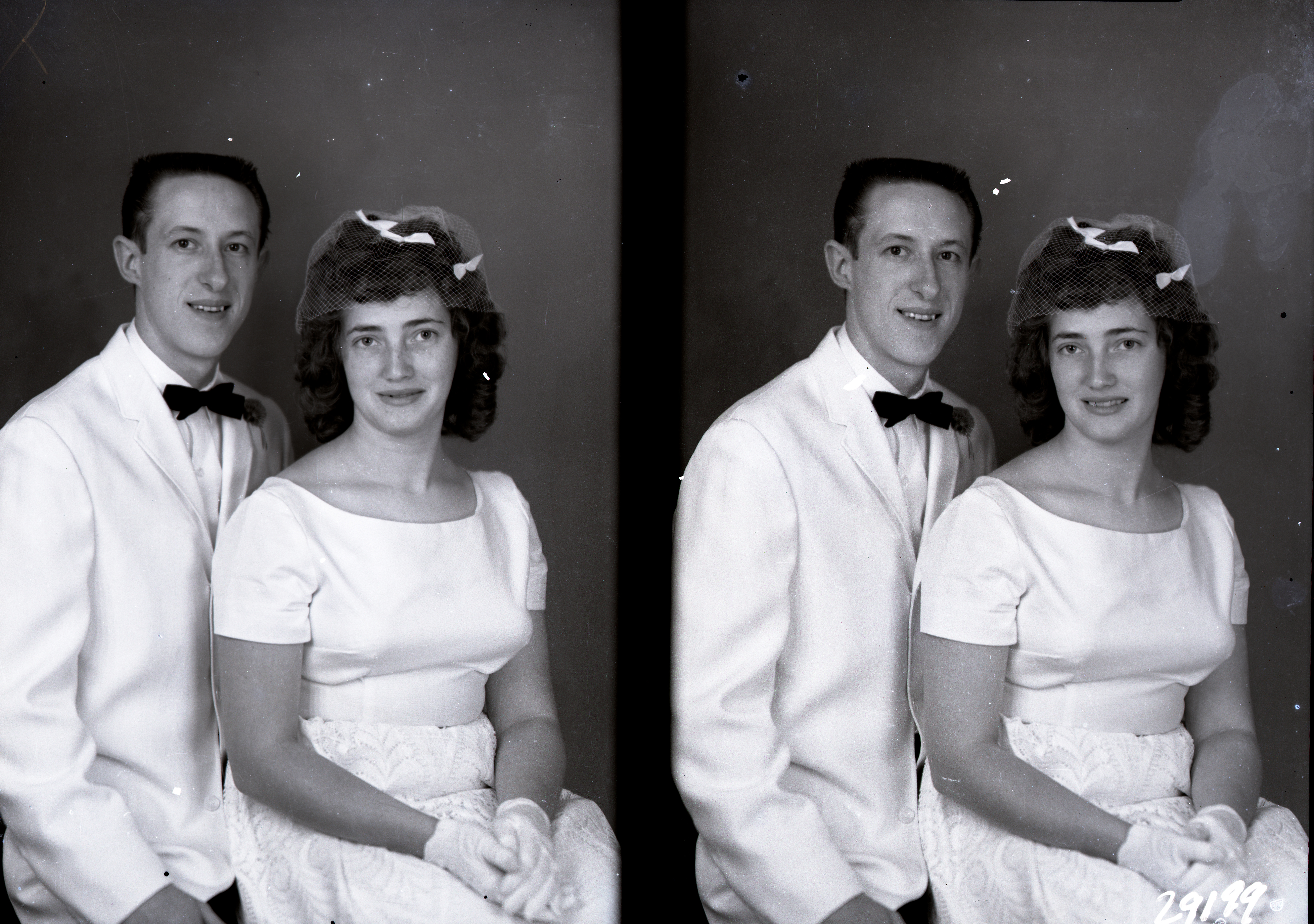 Both are wearing formal wedding attire. This may be their wedding photograph.