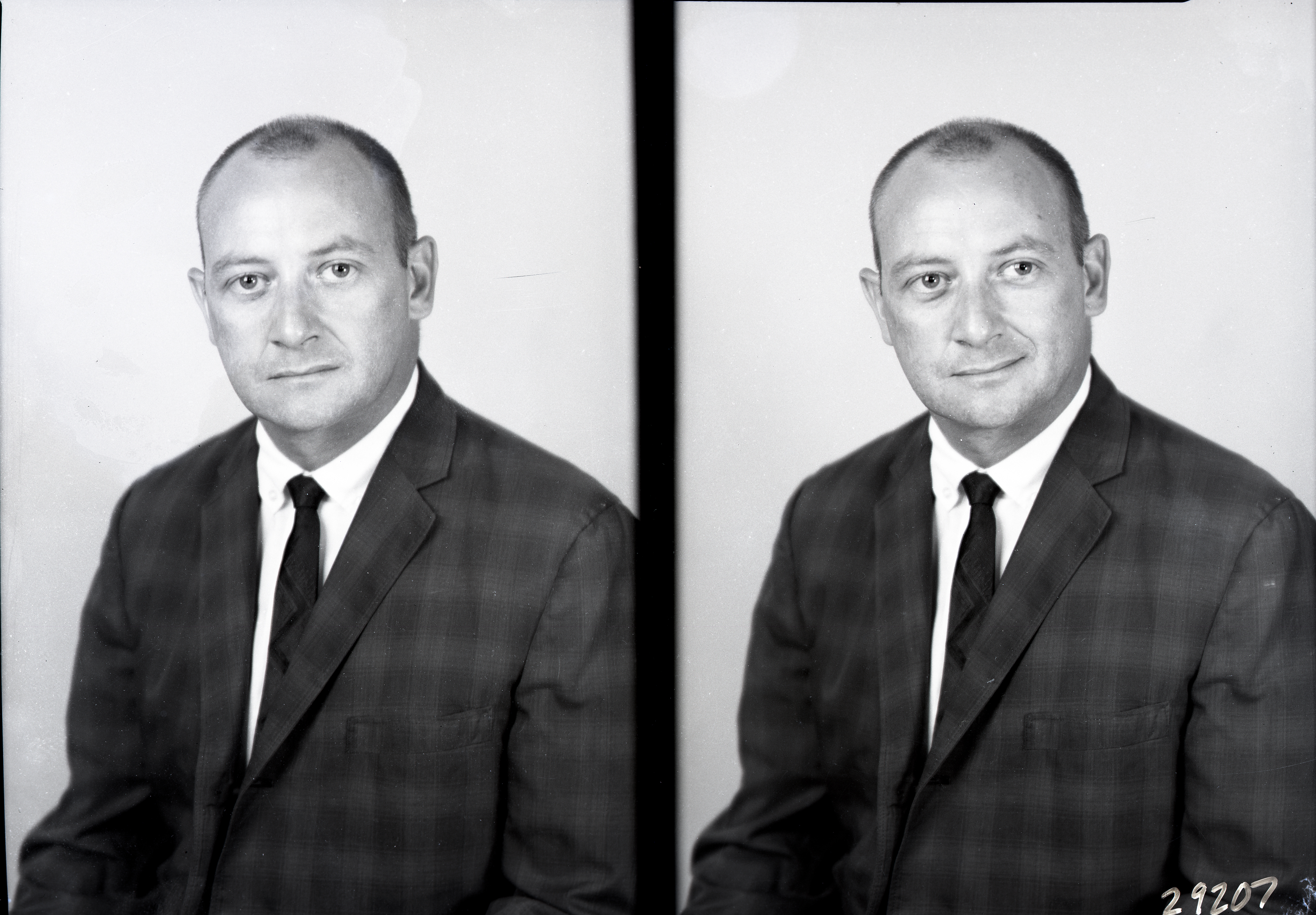 Photo of two separate portrait photographs of Donald K. Funkhouser in a suit and tie.