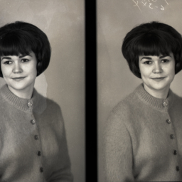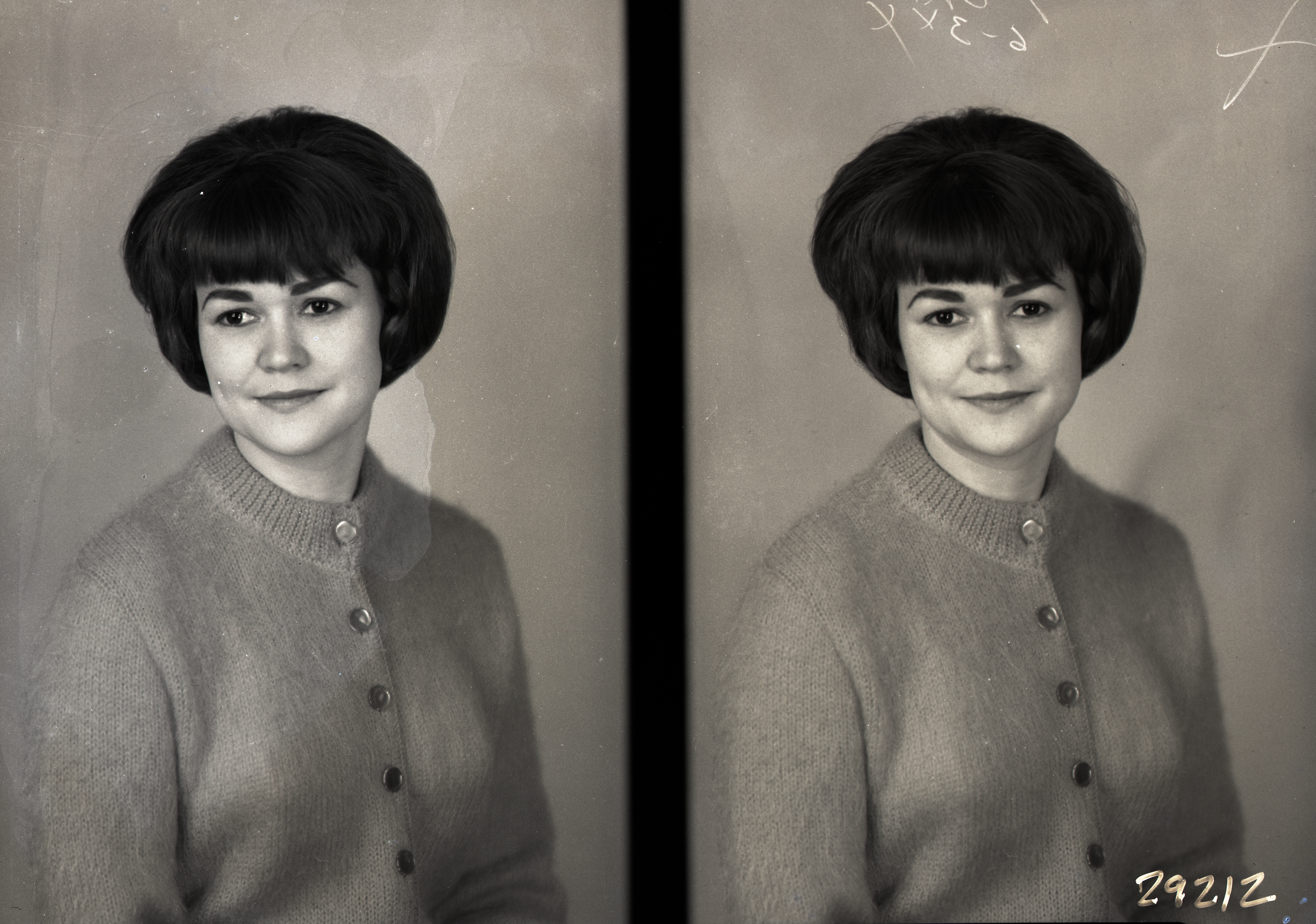 Photo of two separate portrait photographs of Sharon Racey as a young woman with short dark hair and wearing a buttoned sweater.