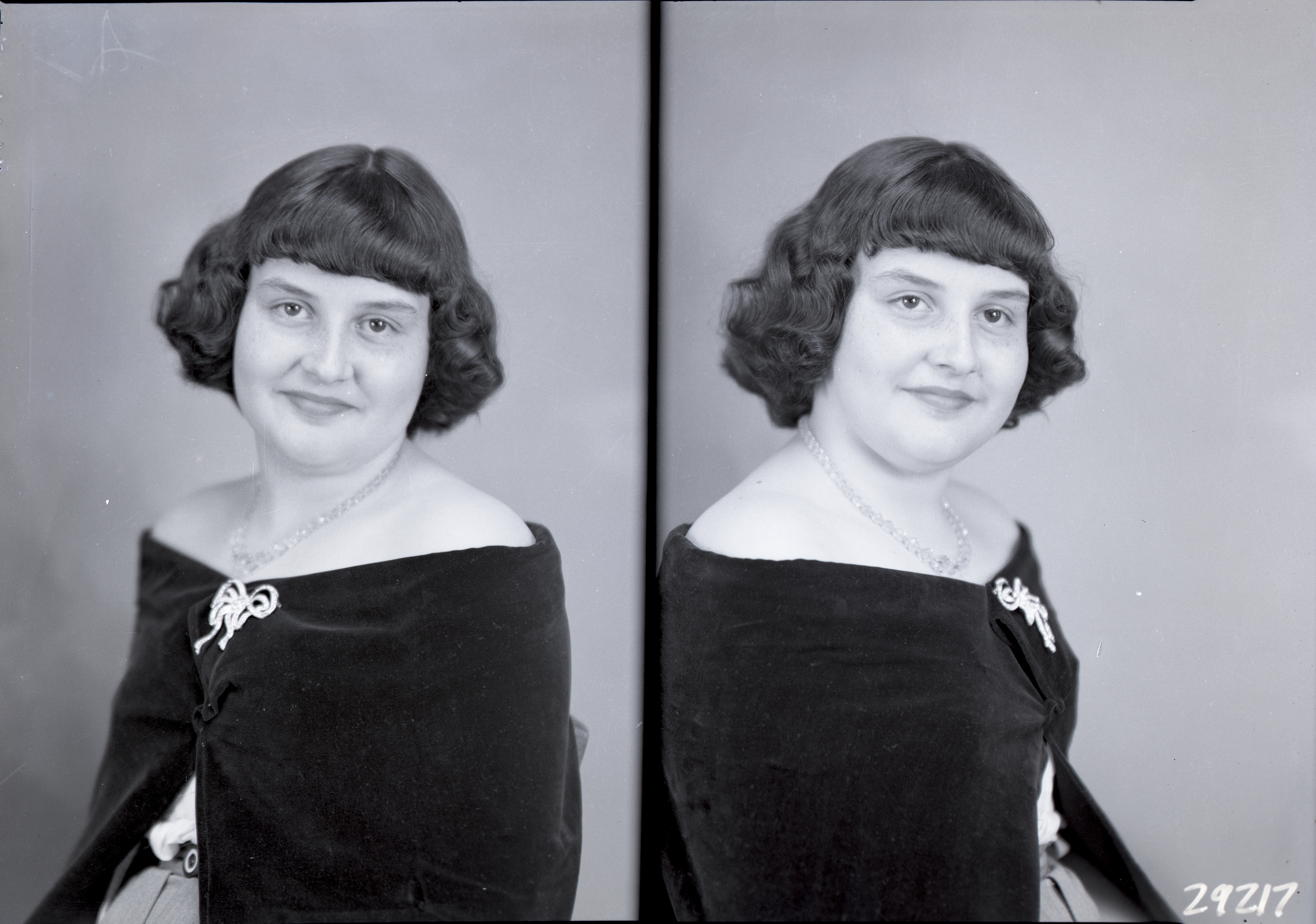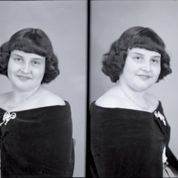 Photo of two separate portrait photograph of the same unidentified young woman with short hair, bangs, and wearing a necklace and pin with what appears to be a photographer's drape.