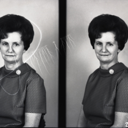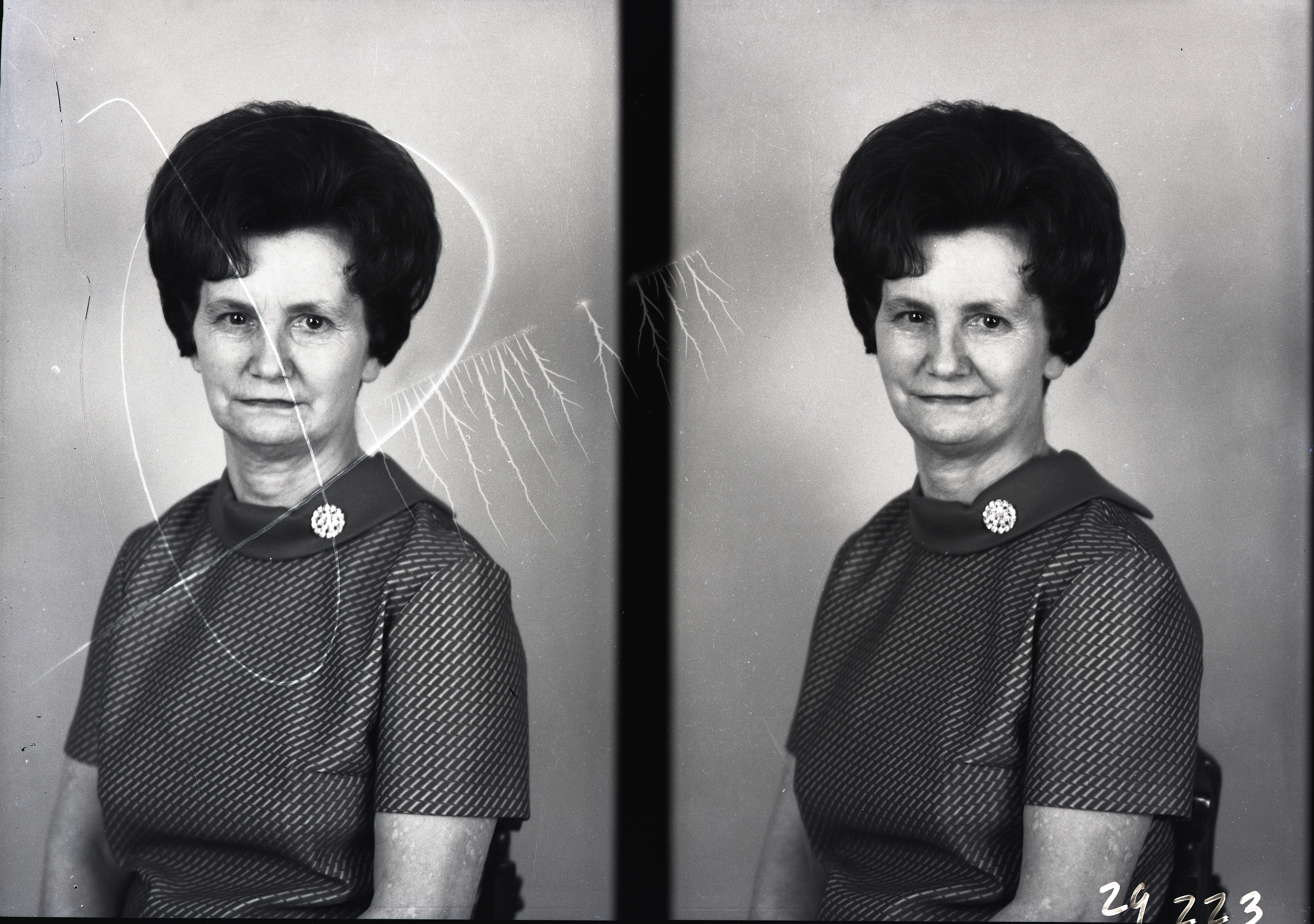 Photo of two separate portrait photographs of the same unidentified woman with short styled hair and wearing a pin on her short-sleeved print dress.