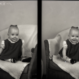 Photo of two separate images of the same unidentified young girl seated on a covered chair.