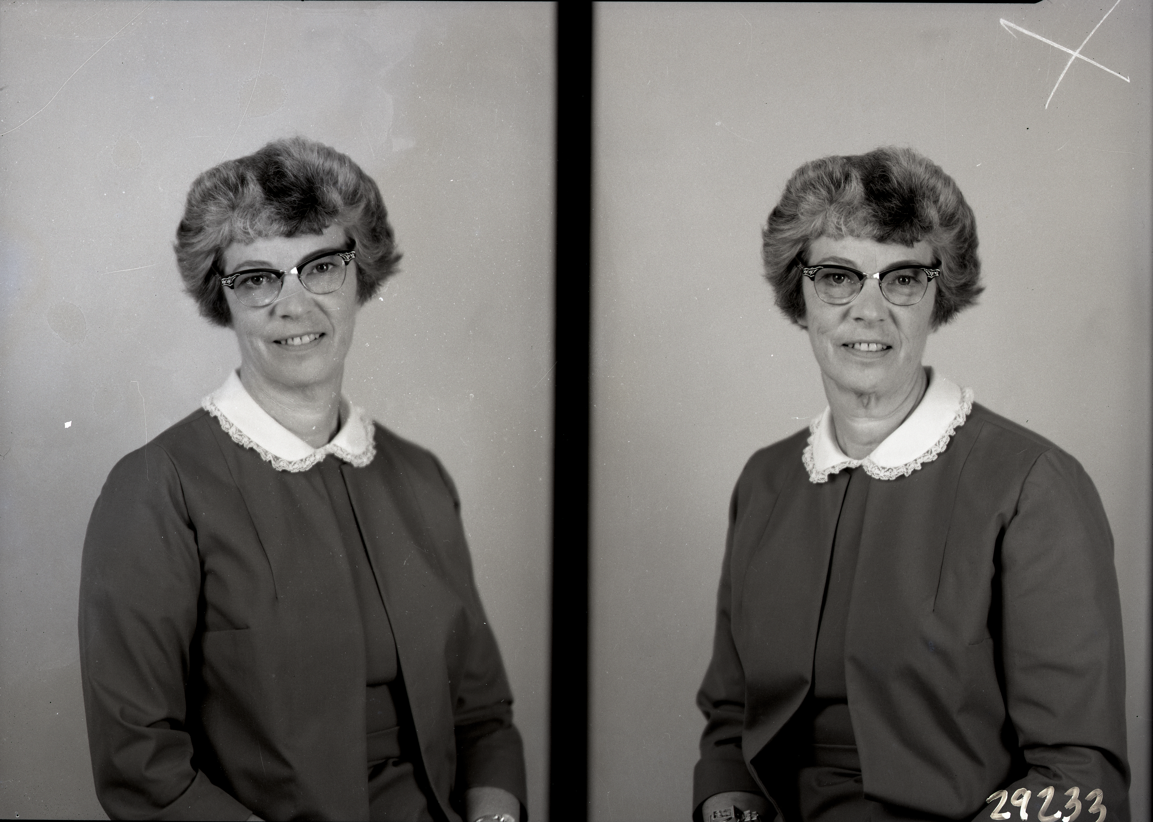 Photo of two separate portrait photographs of the same unidentified woman with short hair and glasses.