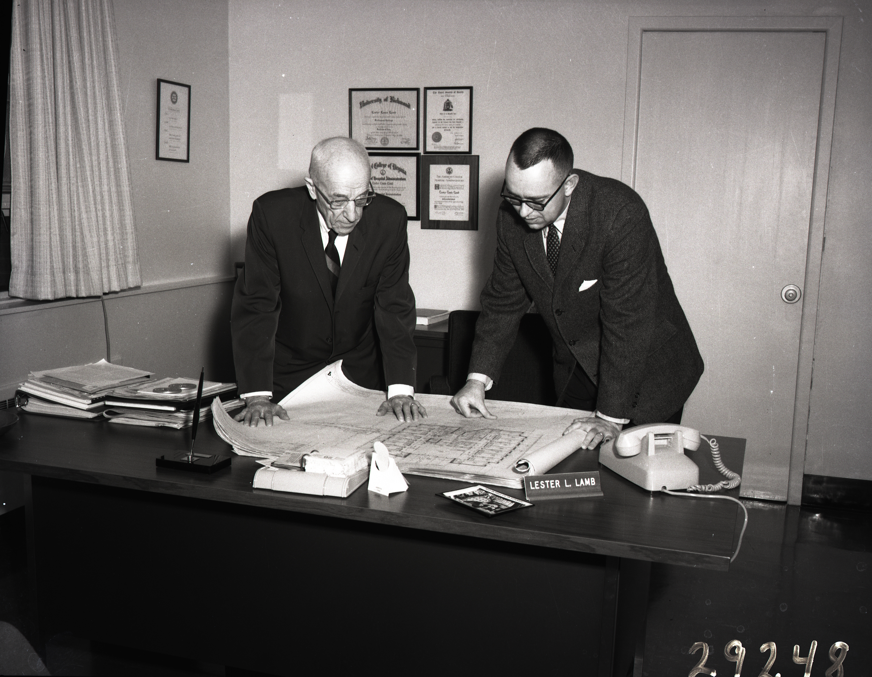 Photograph of Jacob "Jake" Haun, Sr. (left) and Ralph Bauserman (right) standing together and looking down at a set of blueprints on the desk in front of them.