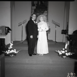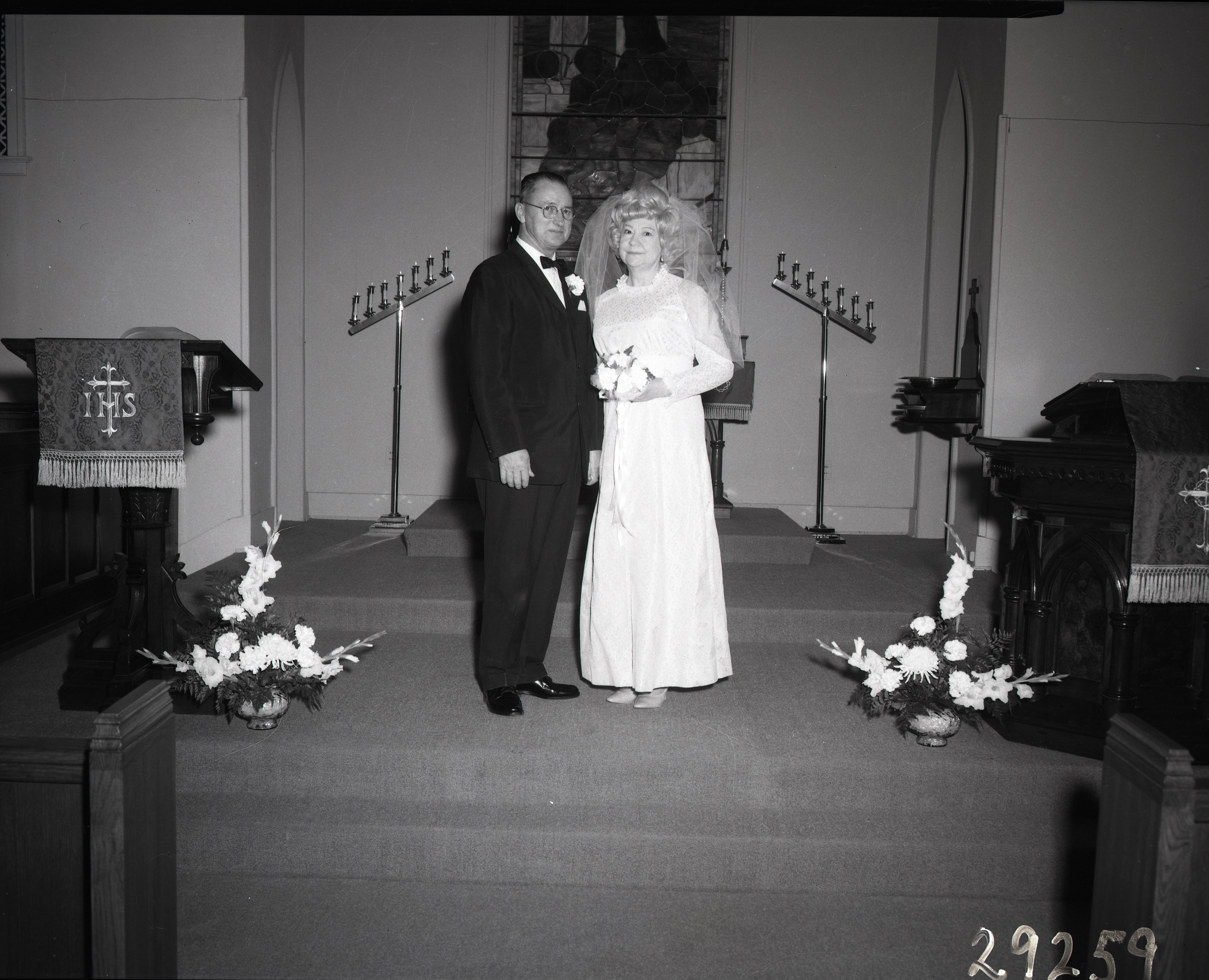 Unidentified bride and groom standing on the altar of Emanuel Lutheran Church in Woodstock and wearing their wedding attire.