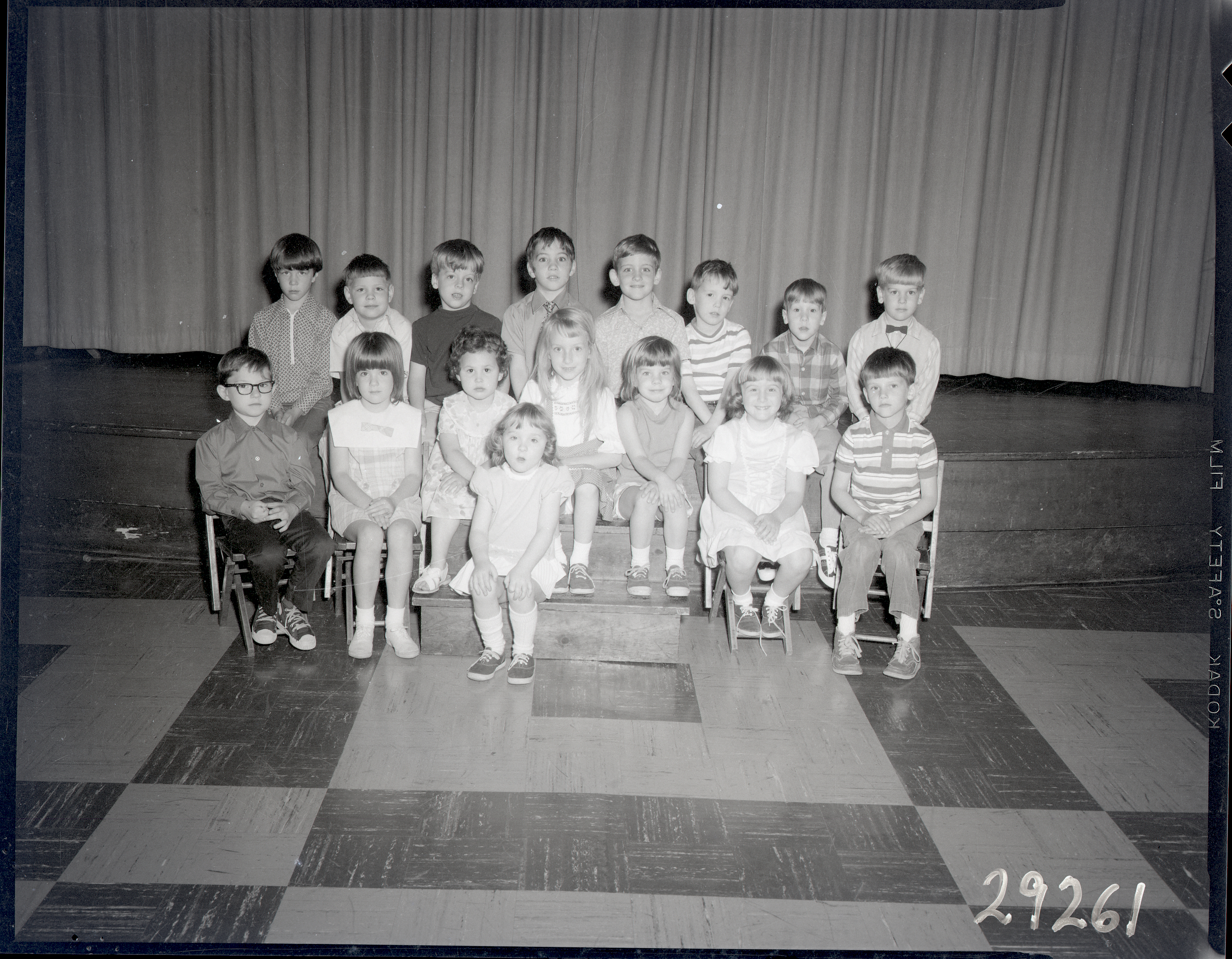 Linoleum flooring is visible in the foreground. A stage curtain is behind the children