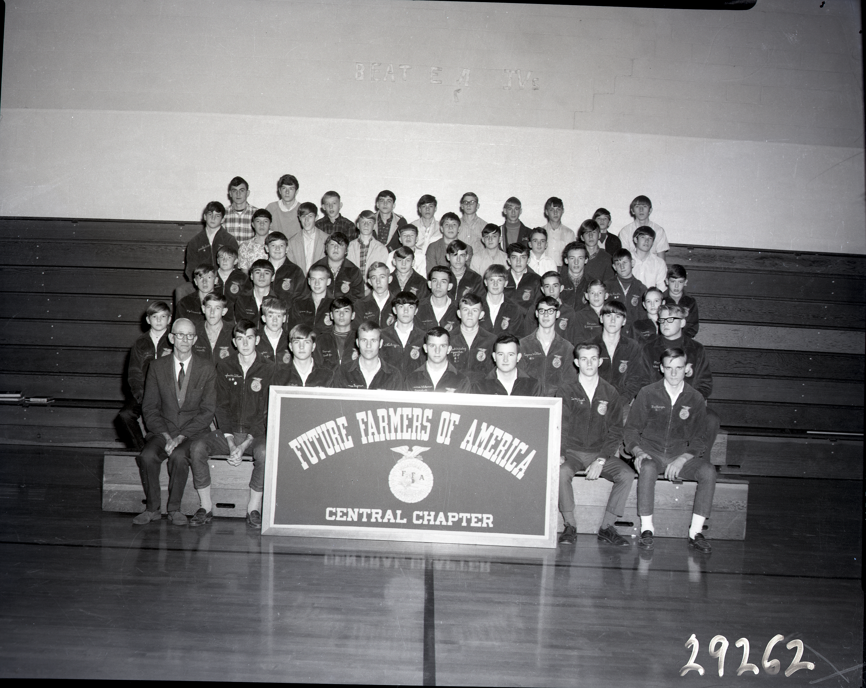 Unidentified members of the Central Chapter of Future Farmers of American (FFA) posed on the bleachers in the Central High School gymnasium.