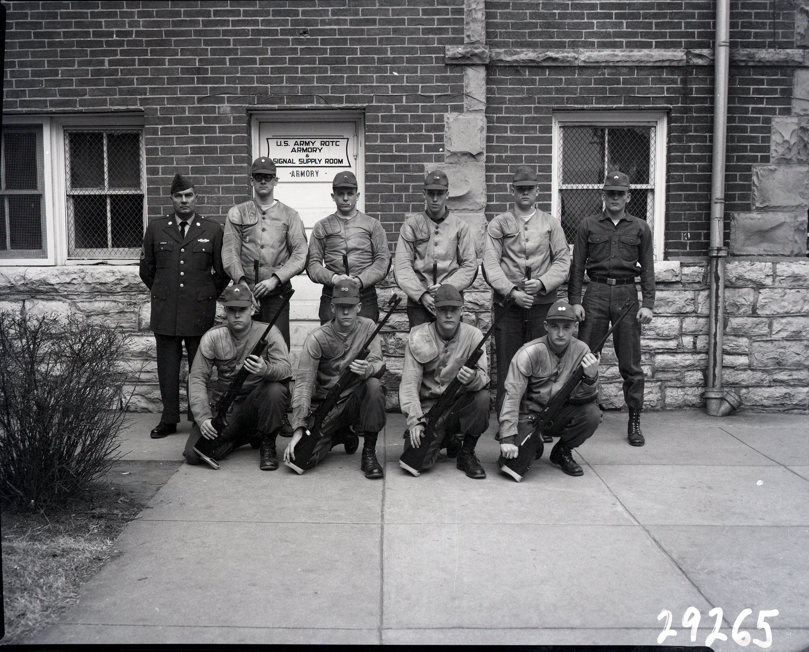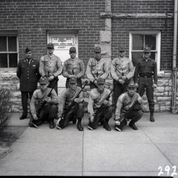 Eight unidentified cadets from Massanutten Military Academy (MMA) wearing protective clothing, caps and holding rifles.