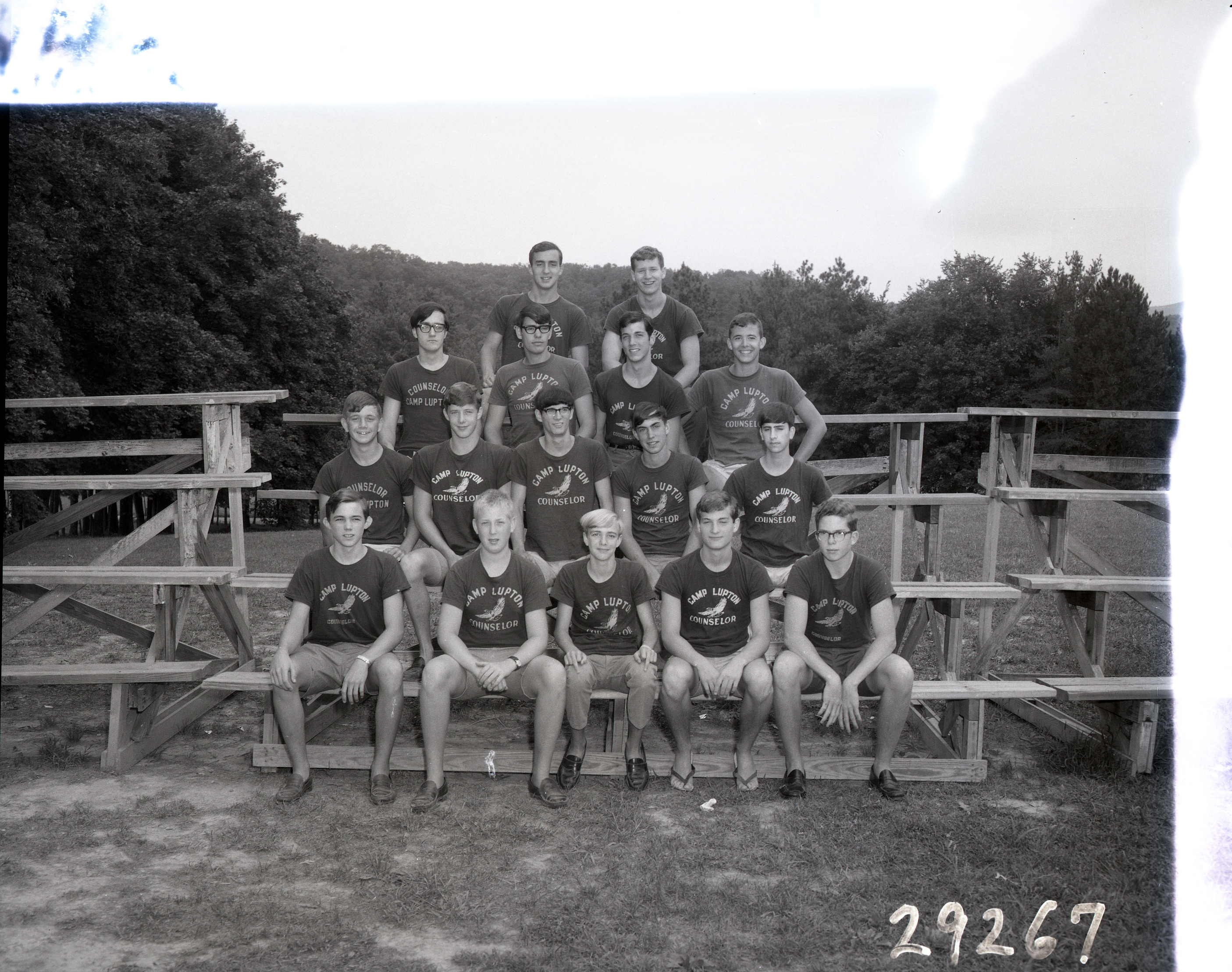 Group of unidentified young men, mostly teen-aged, posed together on bleachers at Camp Lupton. All are wearing the same t-shirt that says, "Camp Lupton - Counselor" on the front.