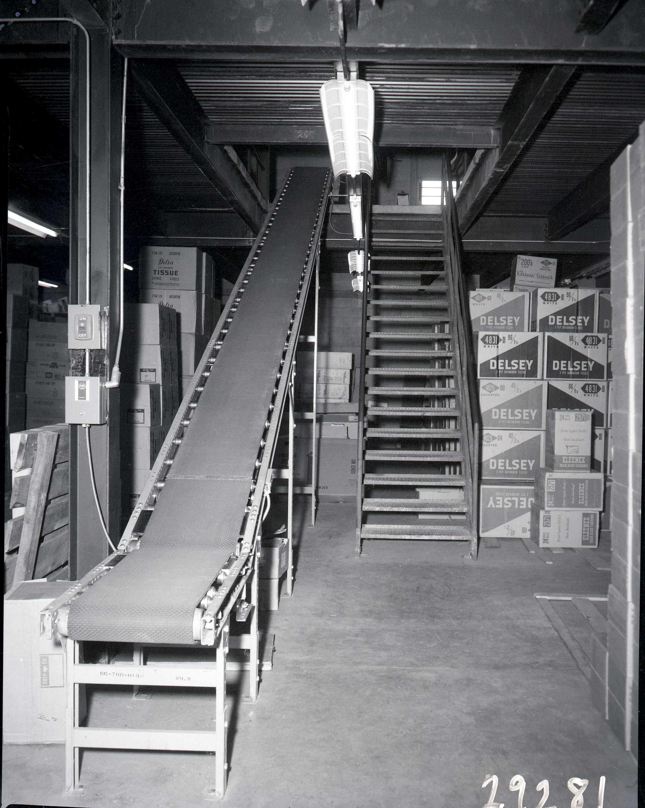 A staircase, a conveyor belt, and several boxes of "Delsey" bathroom tissue are visible.