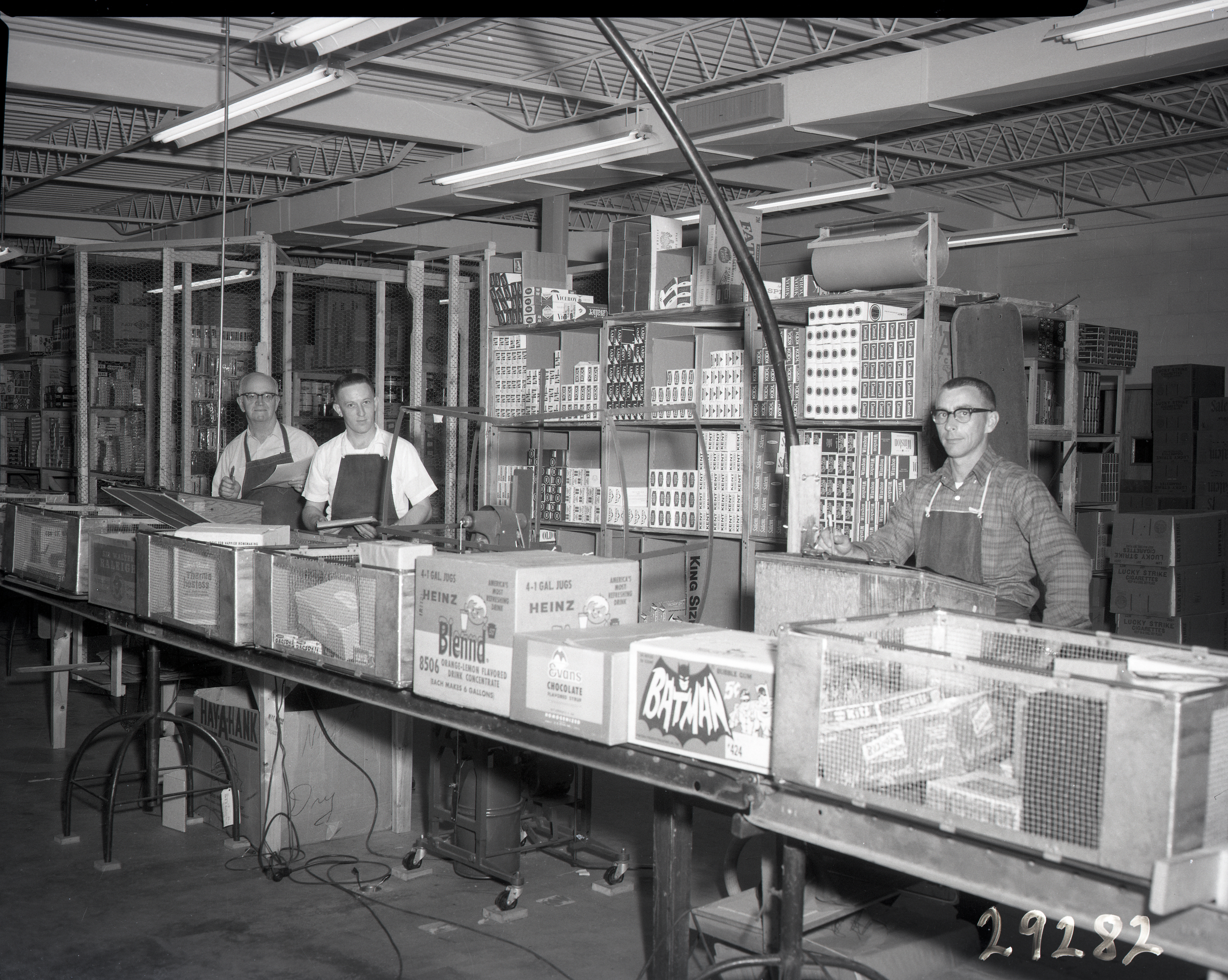 Photograph of three unidentified men wearing work aprons and standing behind a long table loaded with various products sold by Irvin Inc., a wholesale distribution facility also known as the Irvin Candy Company.
