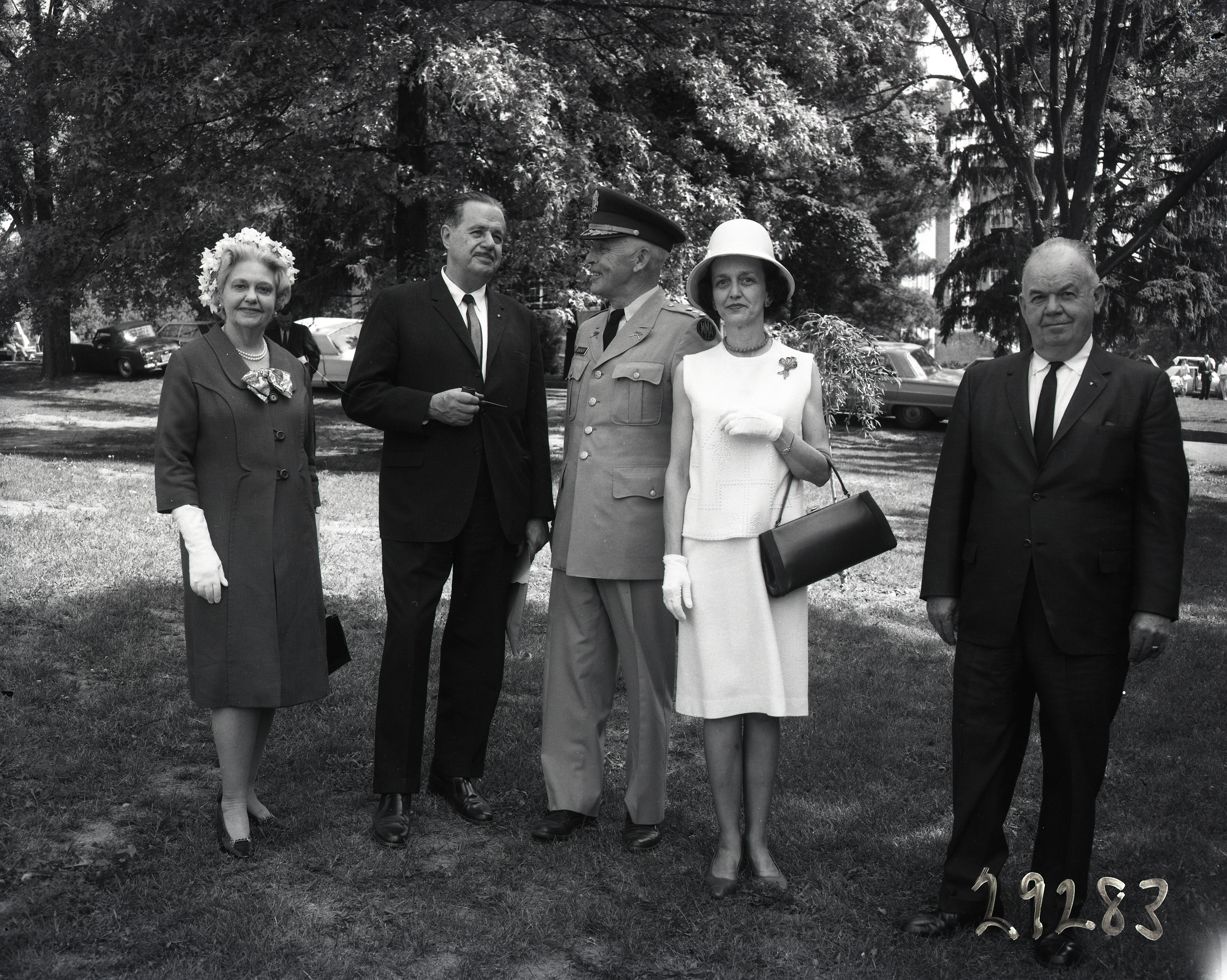 Photograph of Robert J. Benchoff, Headmaster of Massanutten Military Academy (MMA) (third from right), is standing with Gordon Bowman, Sr. (far right) and other unidentified people under trees.