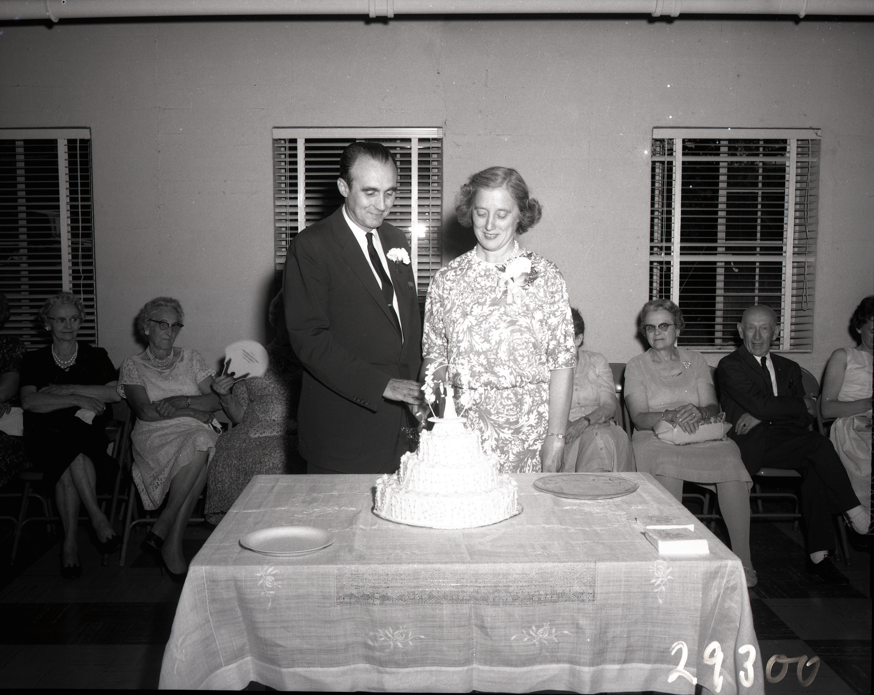 Reverend Edwin Boyd "Jack" Wolford is standing beside his wife, Blanche (Vaughn) Wolford. A multi-tiered cake is on the table in front of them.