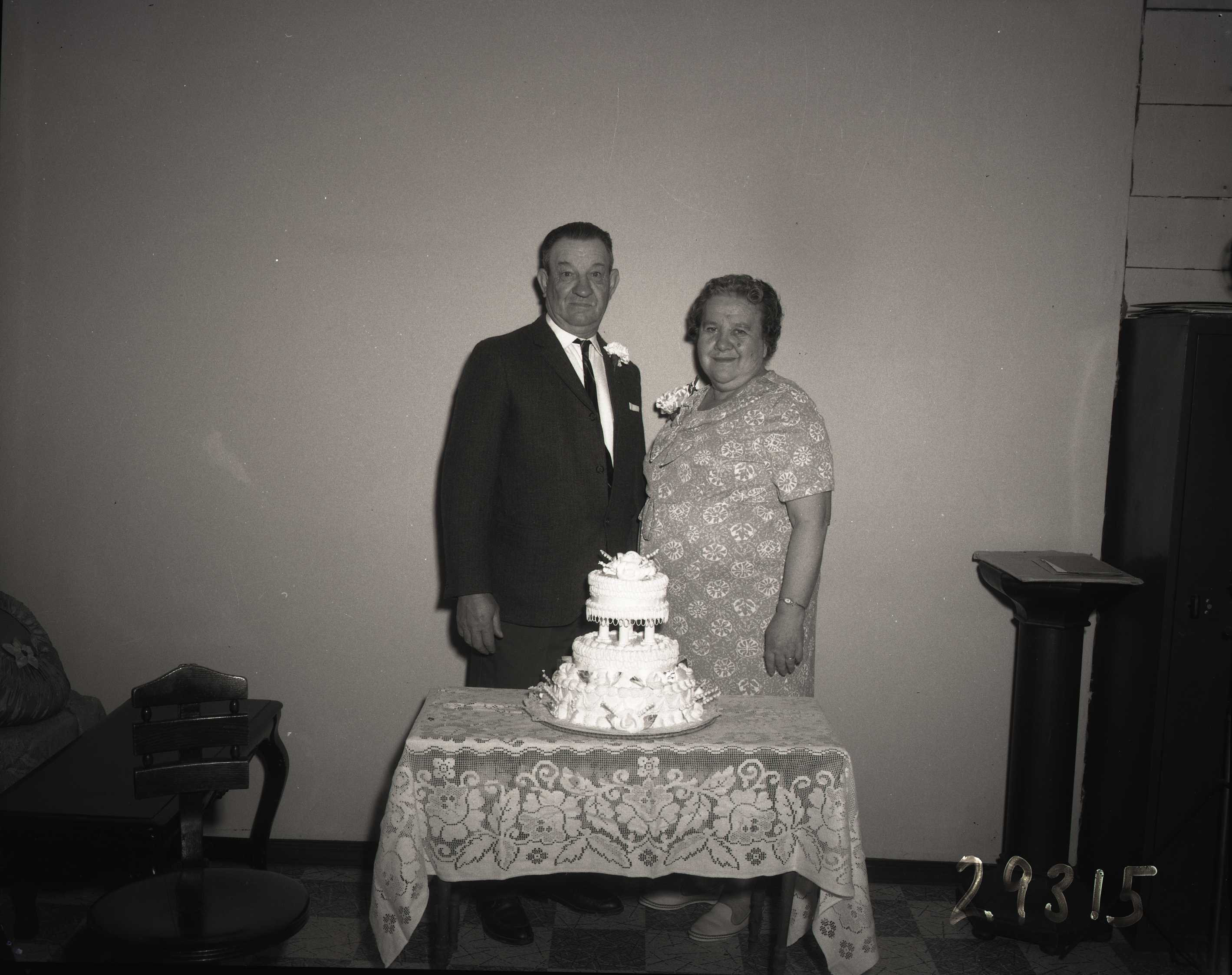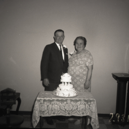 Unidentified man and woman standing together behind a multi-tiered cake. The man is wearing a boutonniere and the woman has a corsage on her dress.