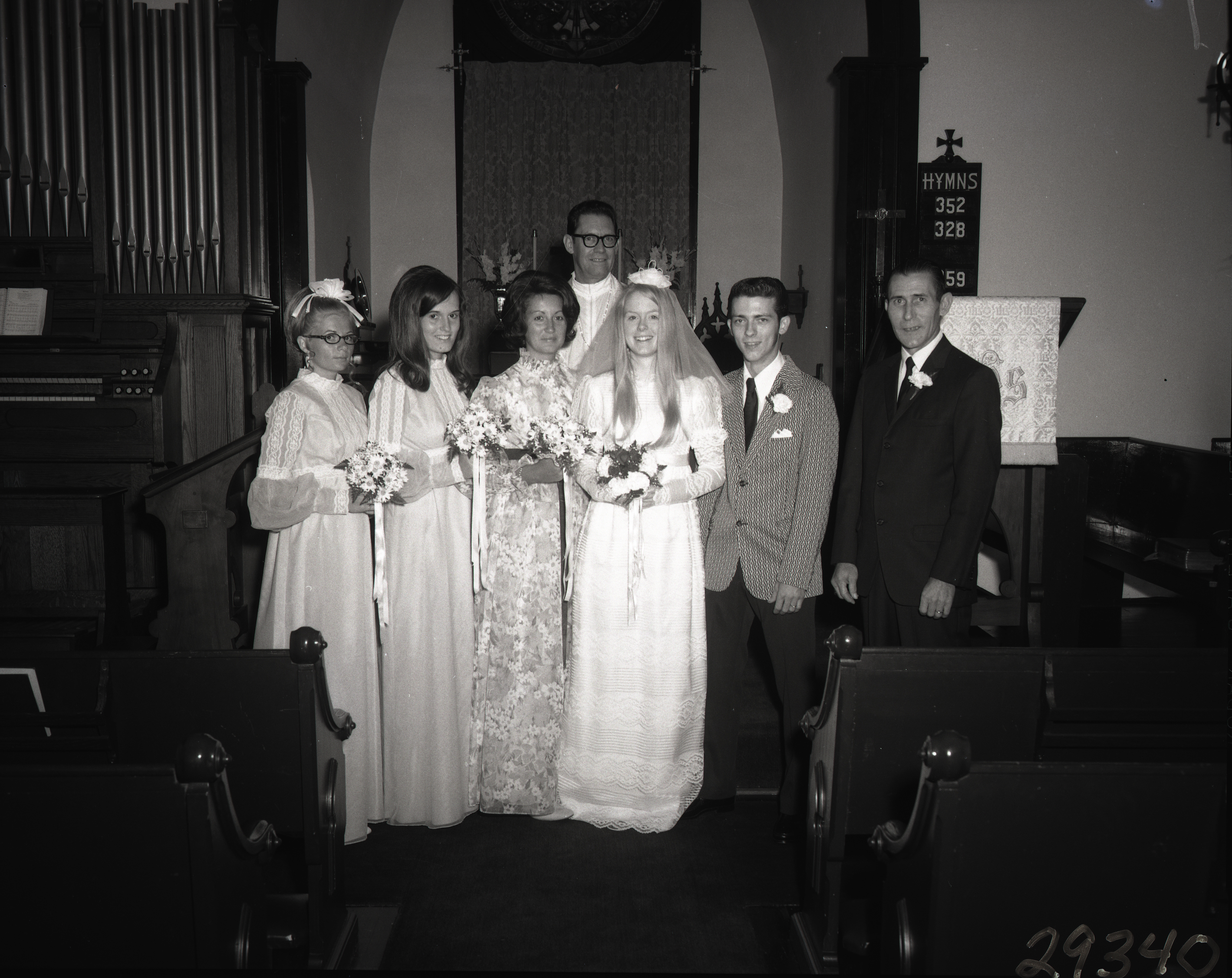 Photograph of Vickie (Ryman) Baker (third from the right) in her wedding dress, veil, and bouquet with her new husband, Butch Baker, standing beside her (second from right).
