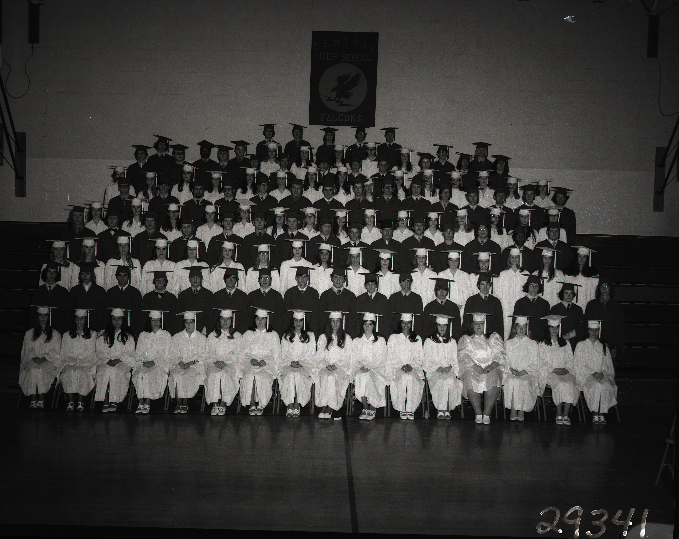 Photograph of a graduating class of unidentified seniors at Central High School in Woodstock, posed on the bleachers of their gymnasium in their caps and gowns.