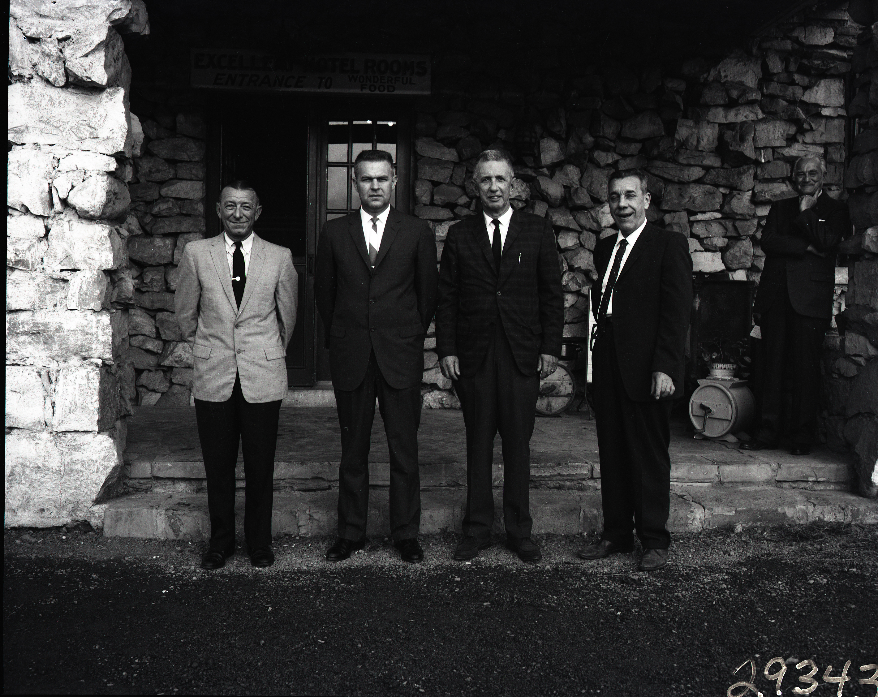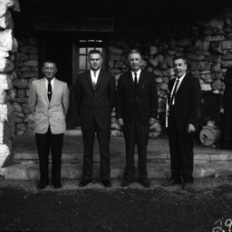 Four unidentified men in suits and ties are standing together in front of a stone building.