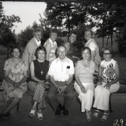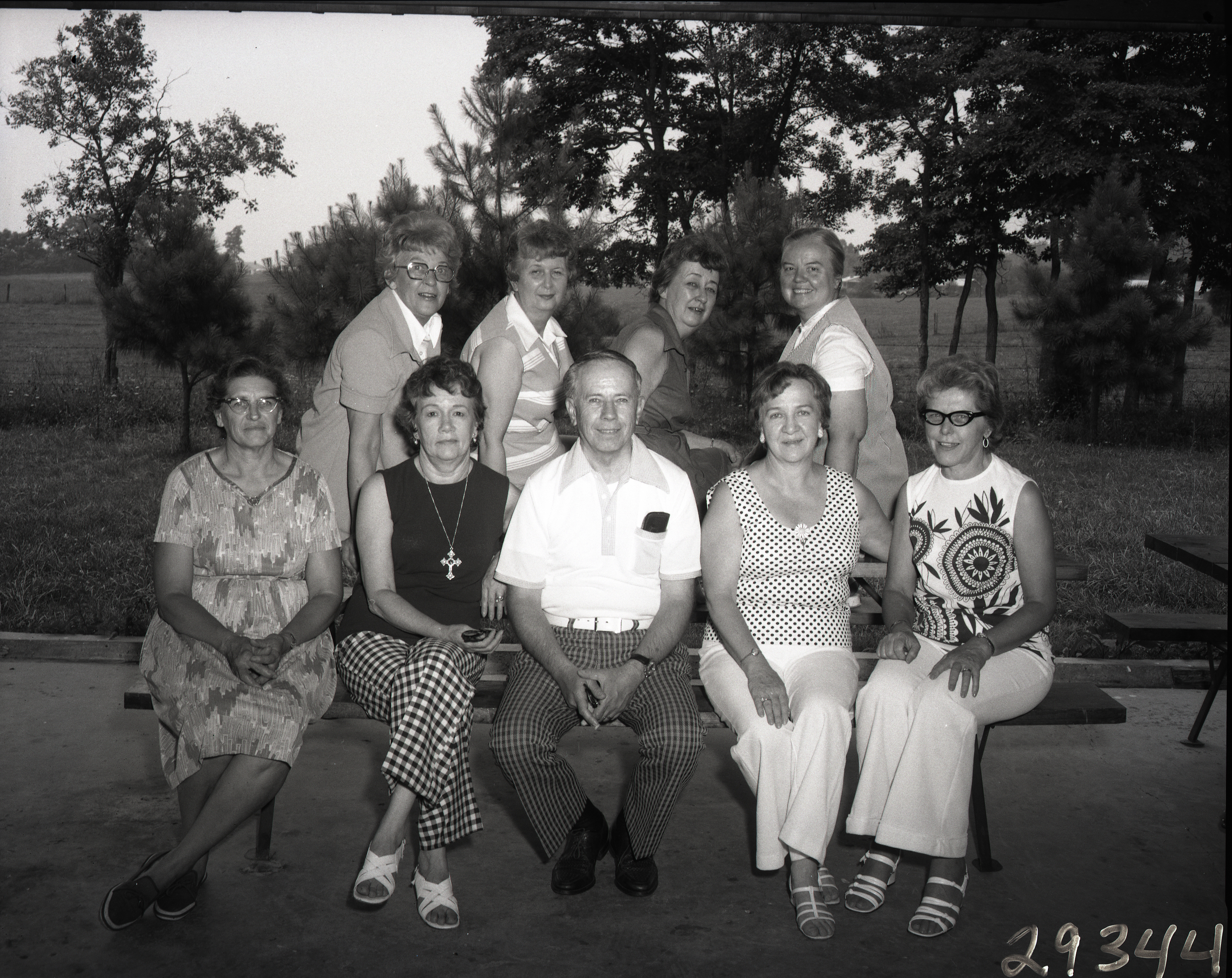 Eight unidentified women and an unidentified man with glasses are posed together on a picnic table. Behind them are trees and fields.