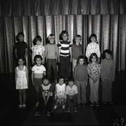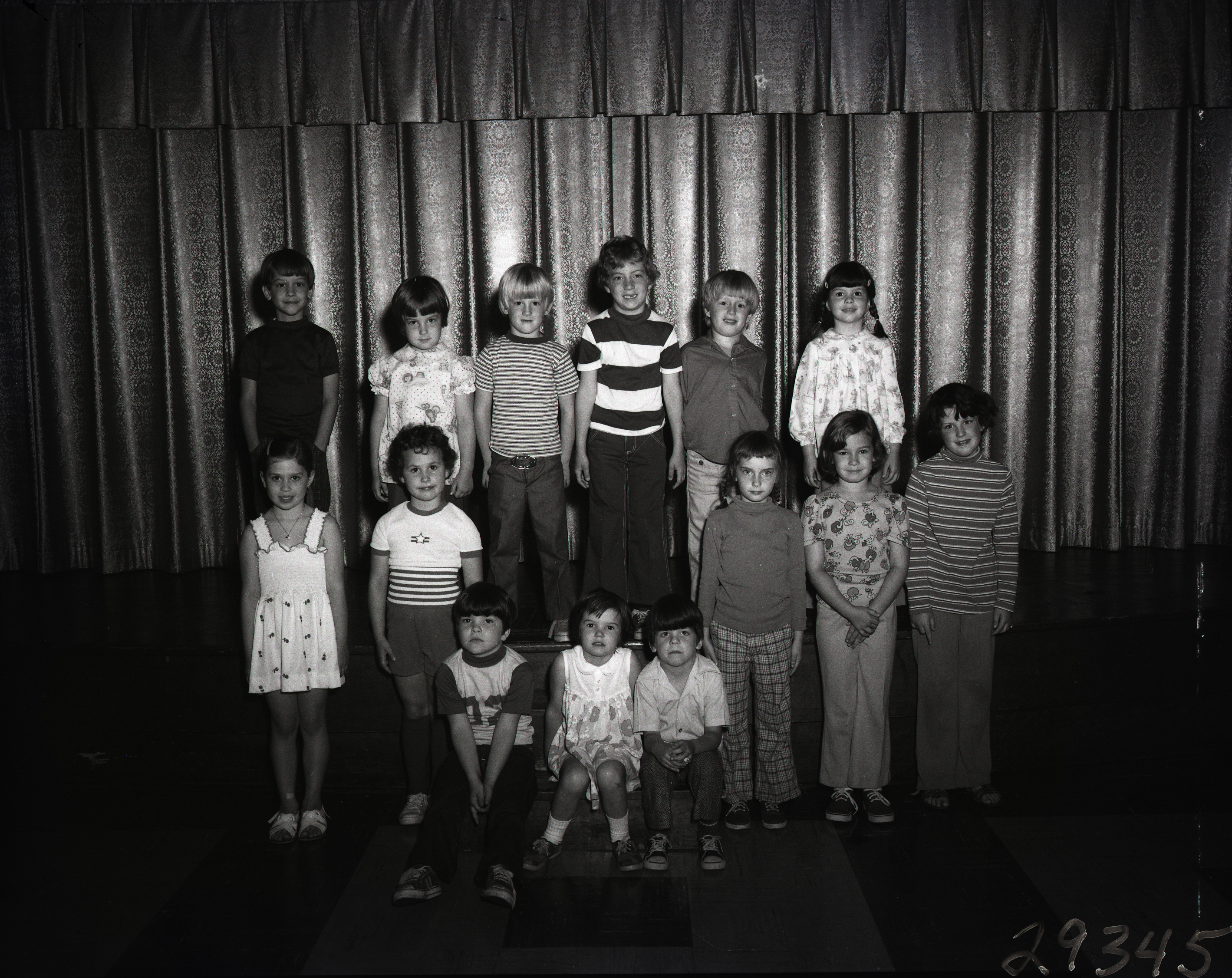 Group photograph of unidentified school children posed together on the steps of a stage.