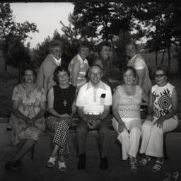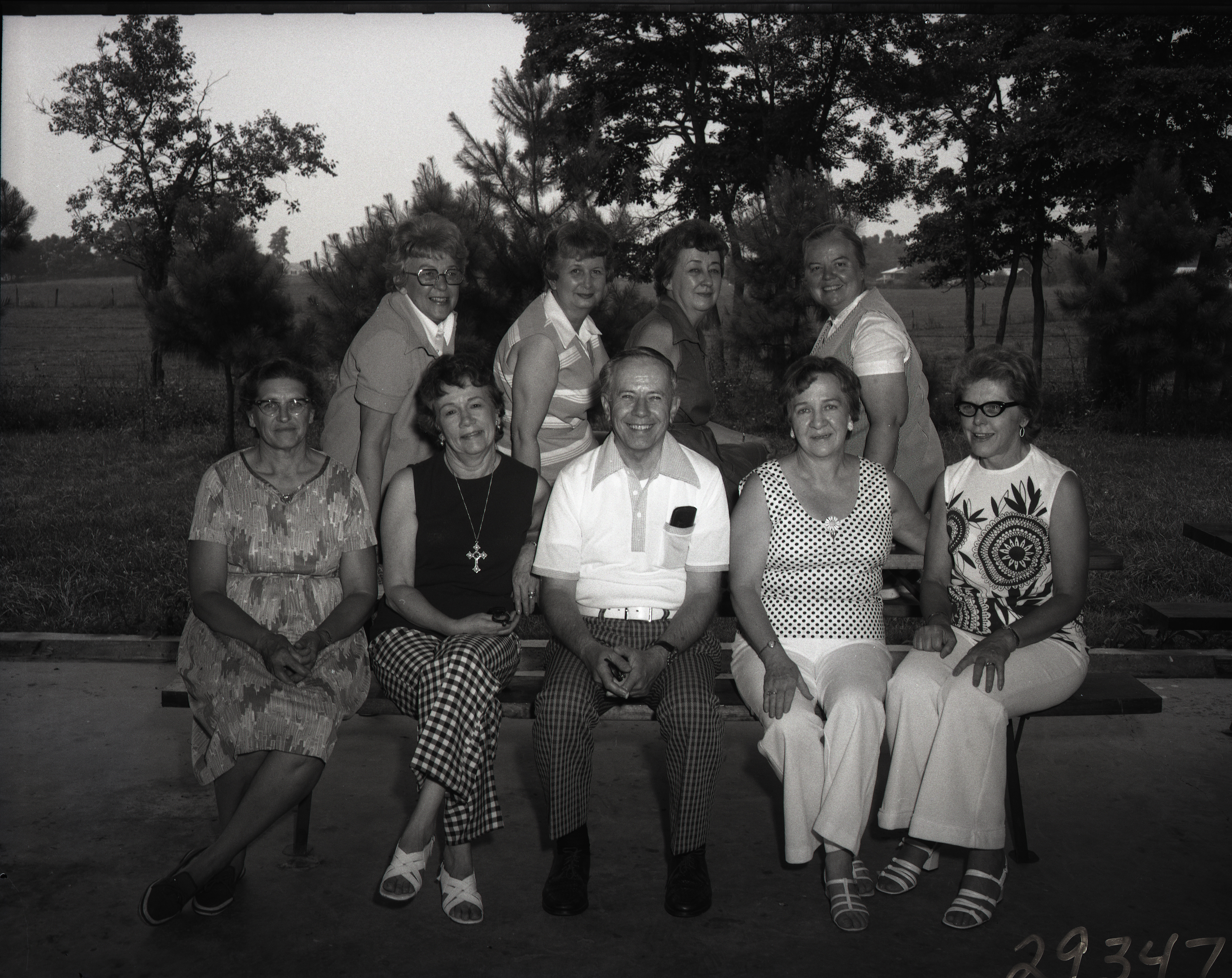 Eight unidentified women and an unidentified man with glasses are posed together on a picnic table. Behind them are trees and fields.