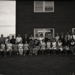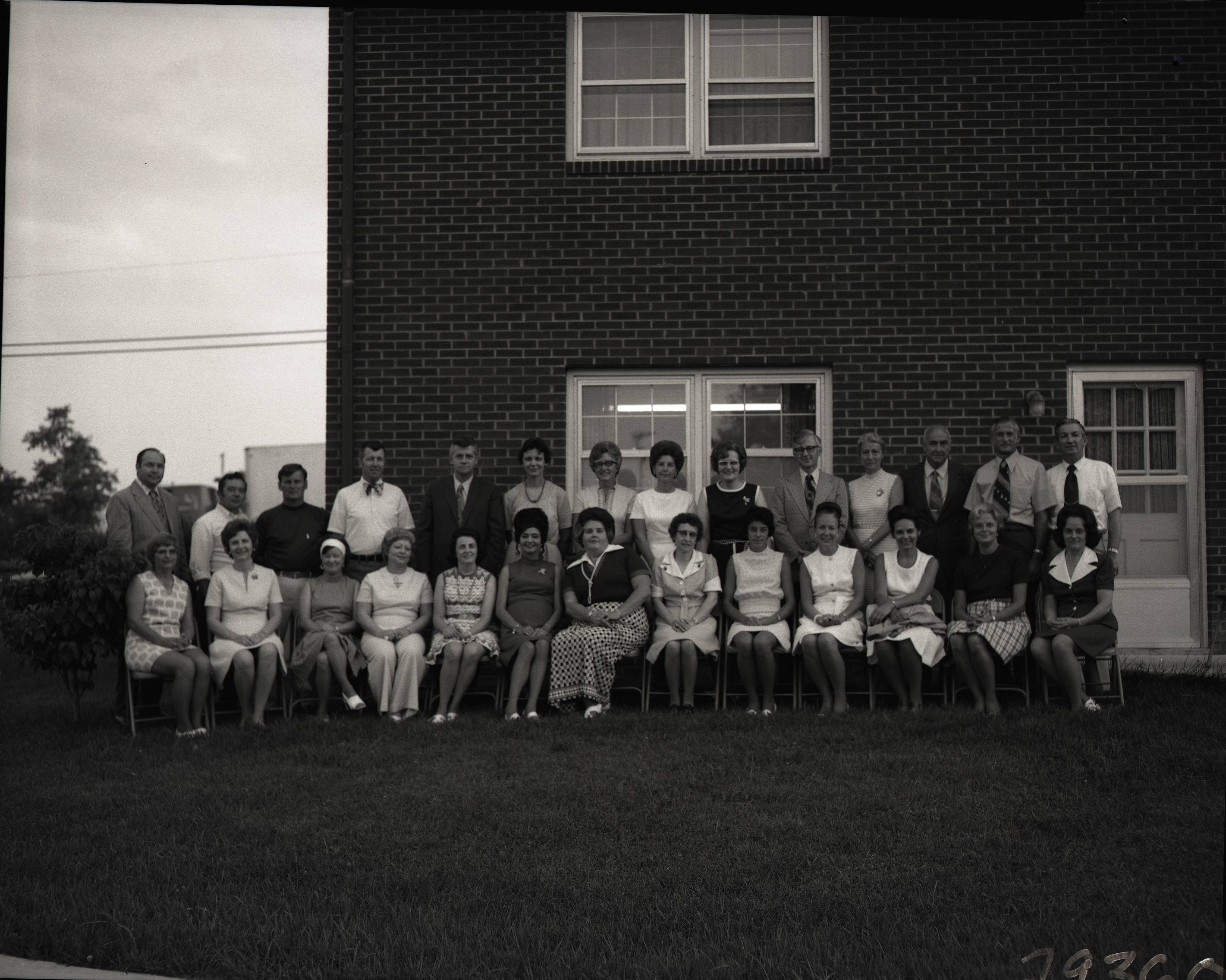 Large group of unidentified men and women posed together in two rows outside a brick building.