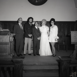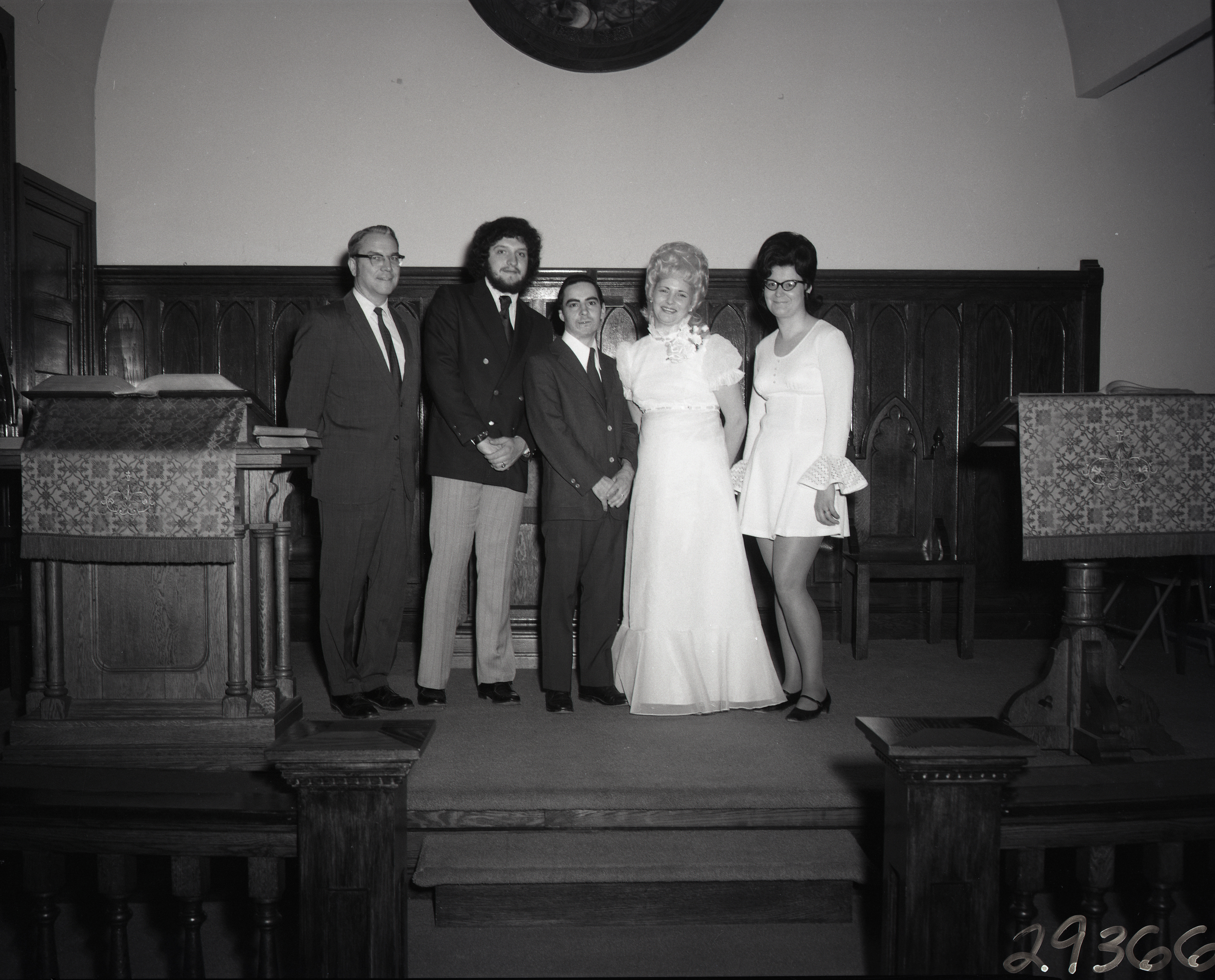 Photograph of an unidentified bride (second from the right), groom (third from right) and other unidentified members of the wedding party.