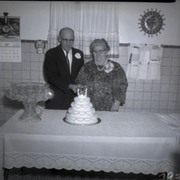 Unidentified older couple is standing together in the kitchen of a home. The man is wearing a boutonniere and the woman has a corsage on her dress.