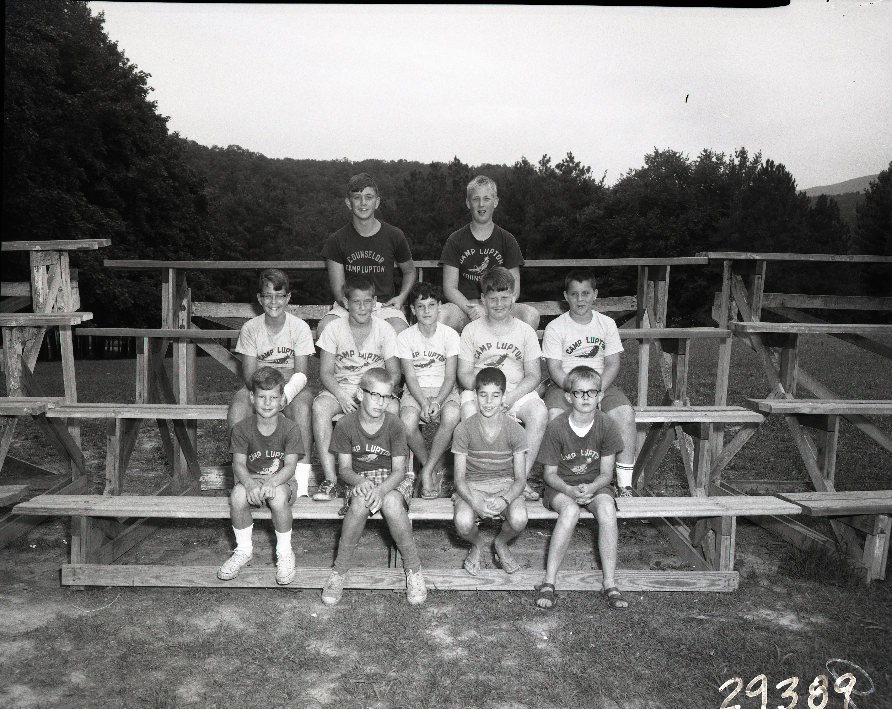 Nine unidentified boys seated on the bleachers at Camp Lupton in Woodstock with their two unidentified counselors seated above them.
