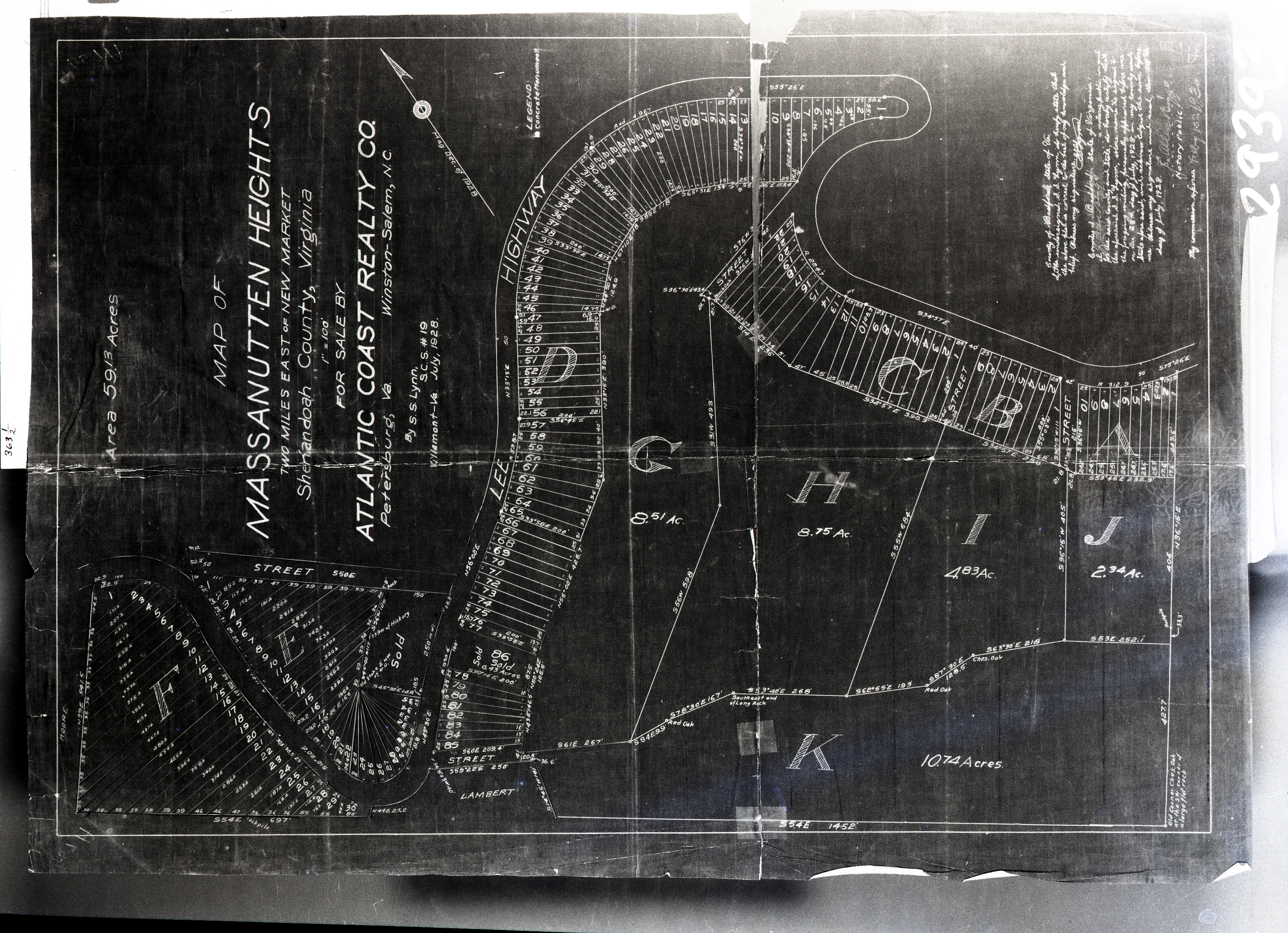 Photograph of the plat map for Massanutten Heights, a subdivision located two miles east of New Market, in Shenandoah County.