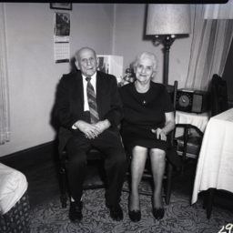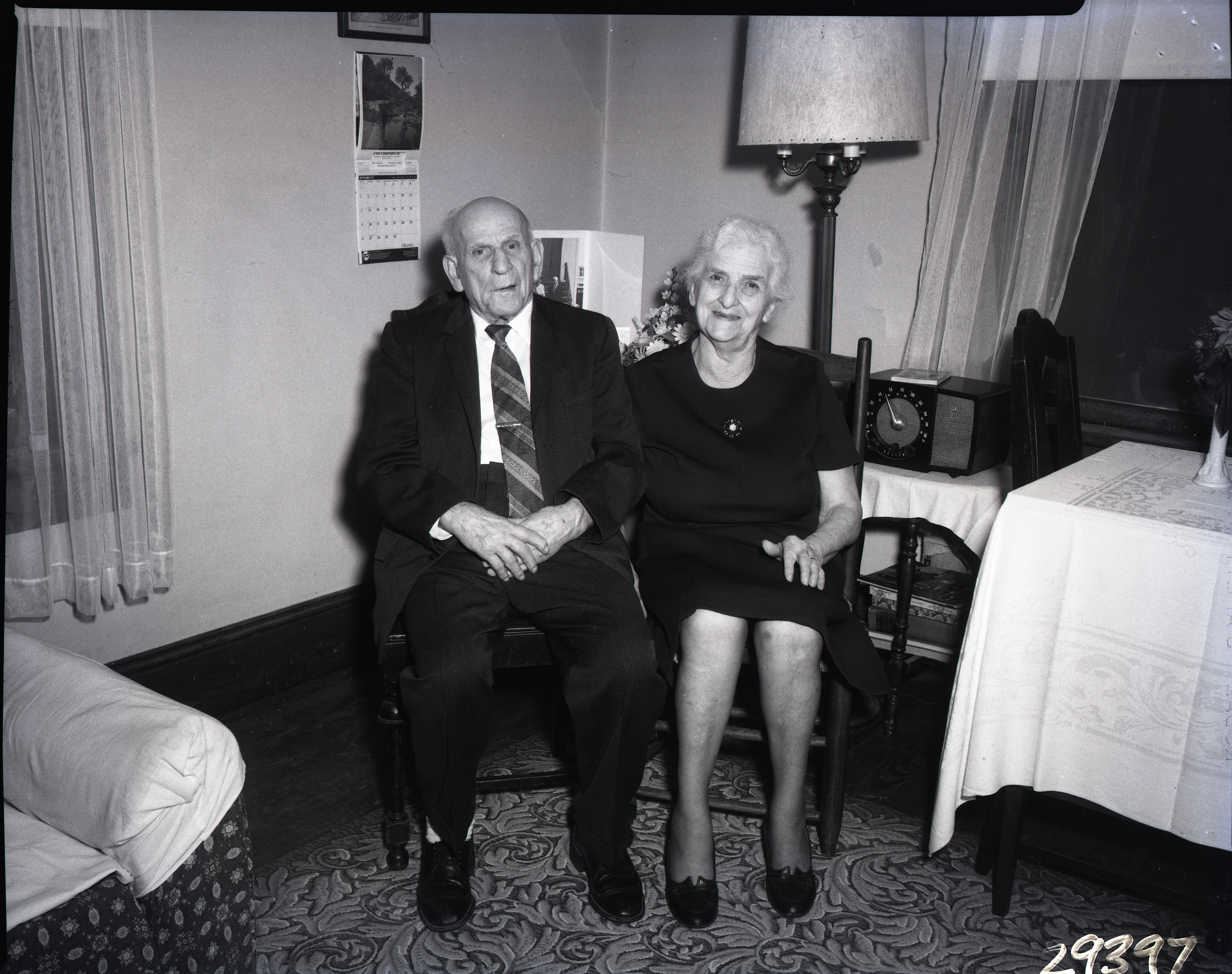 Unidentified older man and woman seated together in a living room.