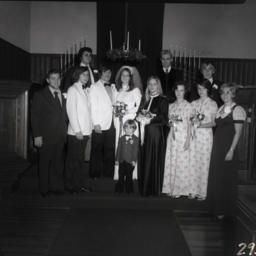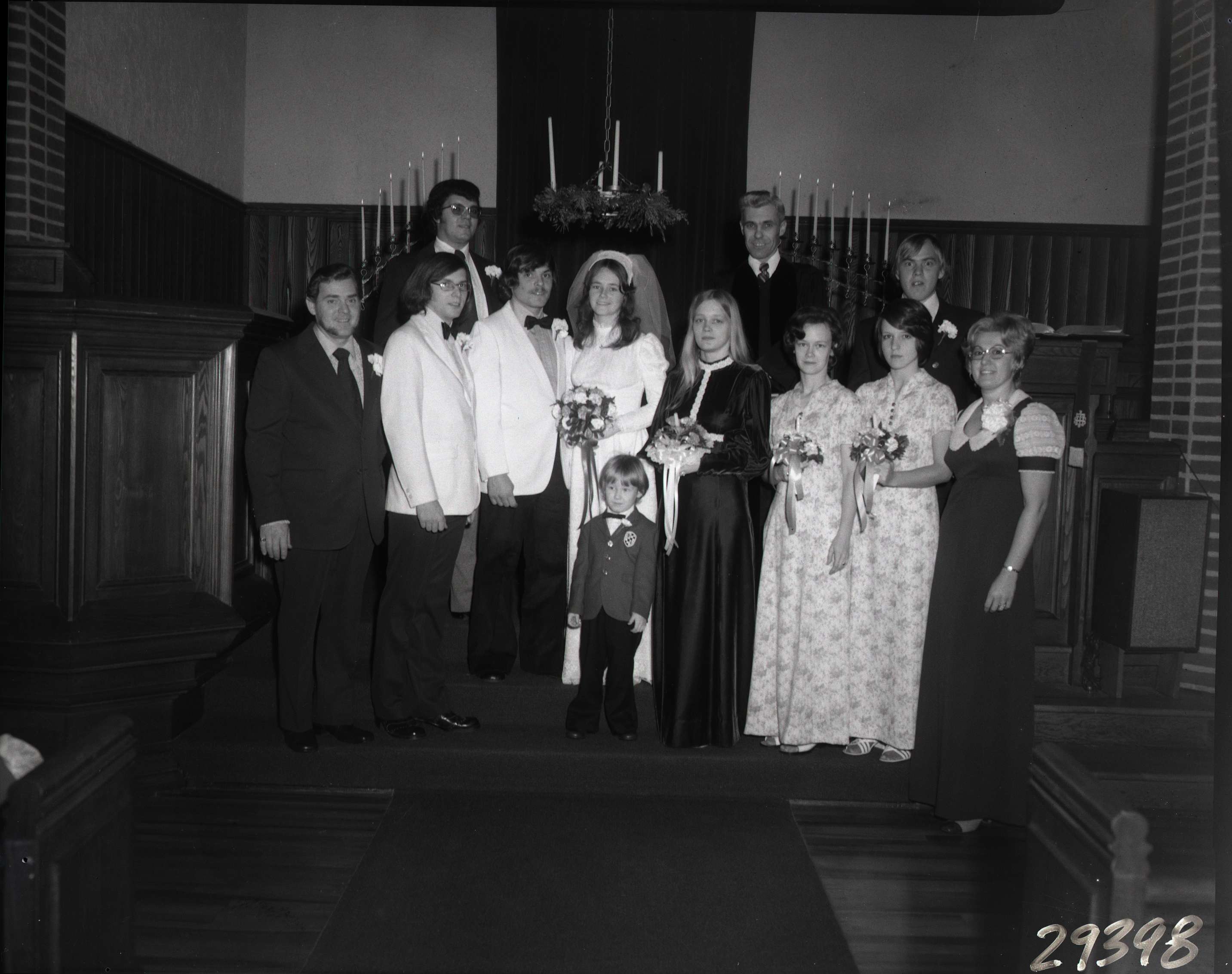 Unidentified bride and groom with the members of their wedding party are posed together on the altar of a church.